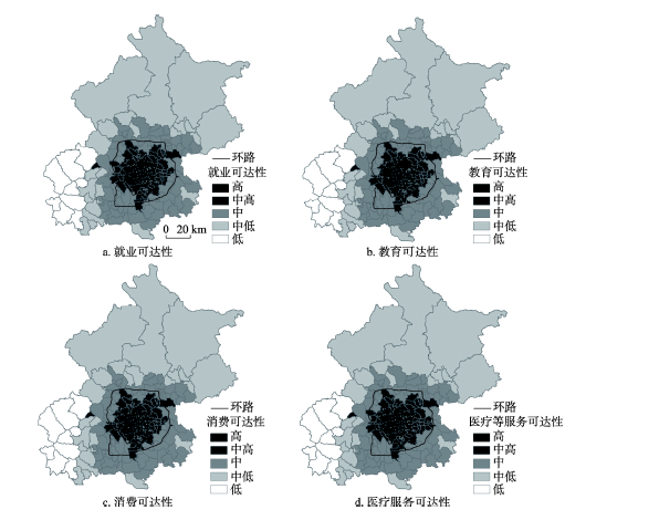 Fig. 2 Beijing urban accessibility by activity图2 基于经济活动的北京交通可达性评价 |