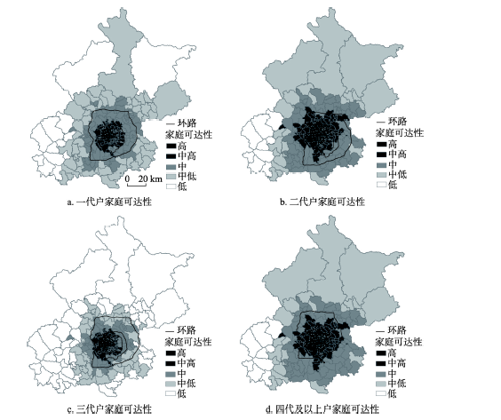 Fig. 3 Values of blocks for different types of households in Beijing图3 北京家庭可达性评价 |