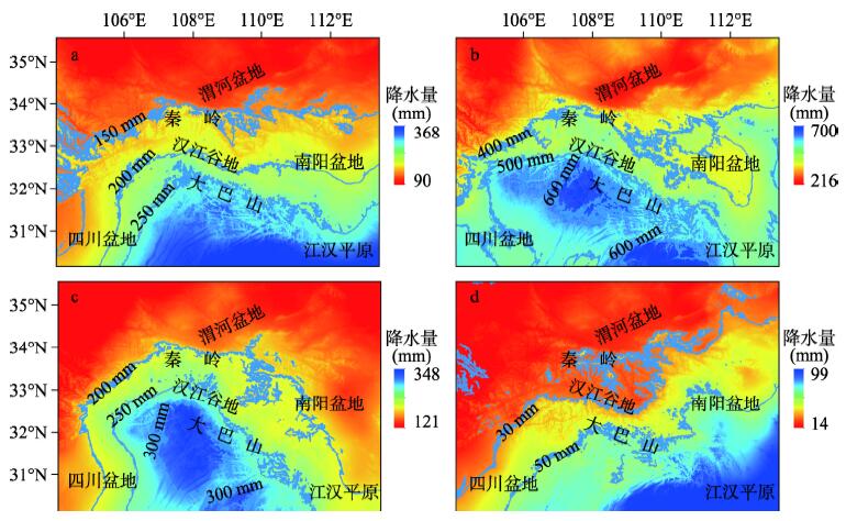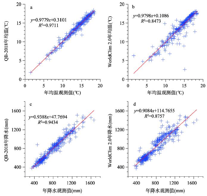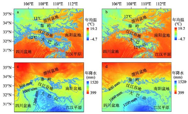 图4 秦岭—大巴山年均温(a, b)和年降水(c, d)空间分布(a、c来自QB-2018数据集(本文),b、d来自WorldClim 2.0数据集[2])Fig. 4 Spatial distribution of annual mean temperature (a, b) and annual precipitation (c, d) in the Qinling-Daba Mountains, where (a) and (c) are from QB-2018 dataset (this study) while (b) and (d) are from WorldClim 2.0 dataset[2] |
