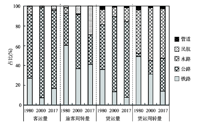 表3 1980-2017年中国运输量变化情况Tab. 3 Changes of traffic volumes in China from 1980 to 2017 |