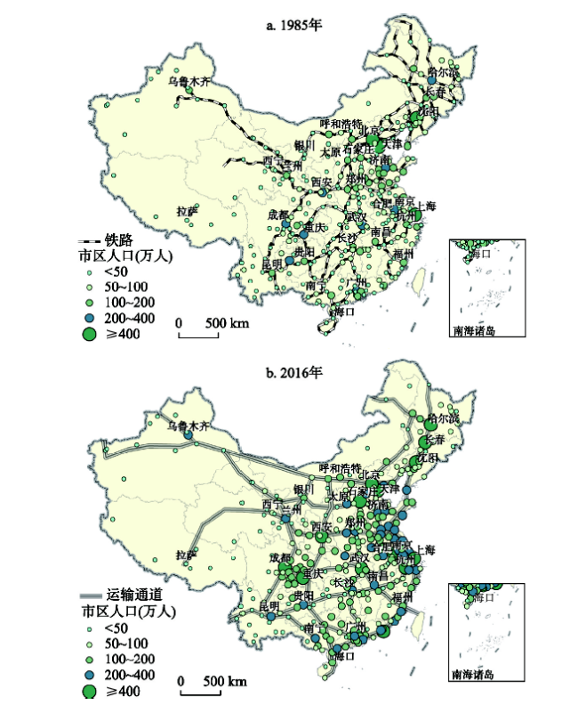 图10 中国交通建设与城市发展格局演变注:资料来源于1986年和2017年《中国城市统计年鉴》。 Fig. 10 Transportation construction and the evolution of urban development pattern in China |