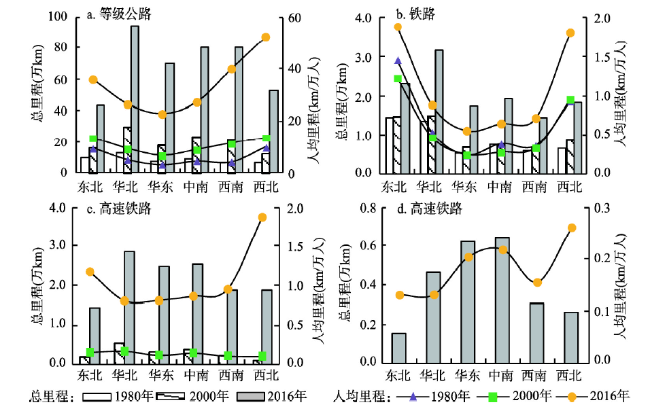 表1 1980-2017年中国交通基础设施变化情况Tab. 1 Changes of transportation infrastructure in China from 1980 to 2017 |