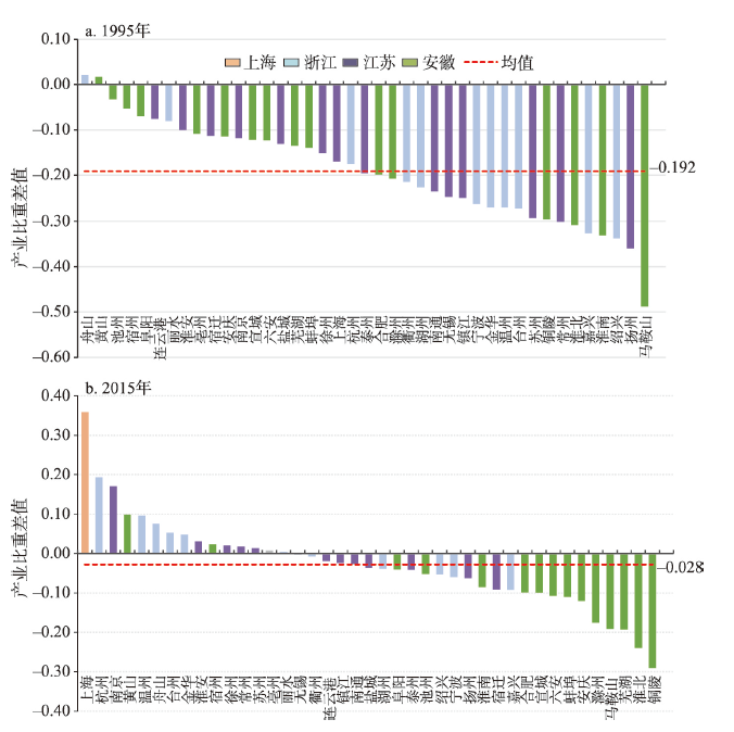 表2 1995年和2015年长三角城市二、三产业产值指标统计Tab. 2 Statistic indicators of secondary and tertiary industries in the Yangtze River Delta region in 1995 and 2015 |