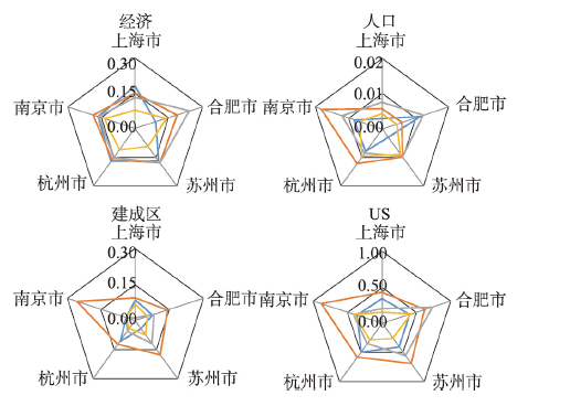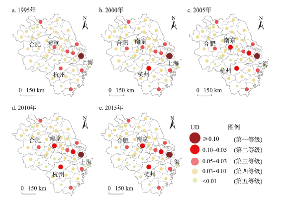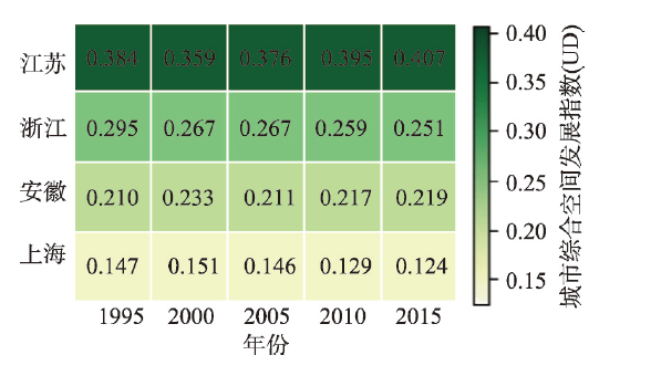表1 长三角地区主要城市的综合空间发展指数(UD)值Tab. 1 Urbanization comprehensive development (UD) values of major cities in the Yangtze River Delta region |