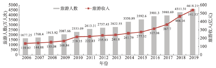 表1 2000—2019年全国主要旅游城市国内旅游人数增长(万人次)Tab.1 The growth of tourist number from 2000 to 2019 in main tourism cities of China (ten thousand) |