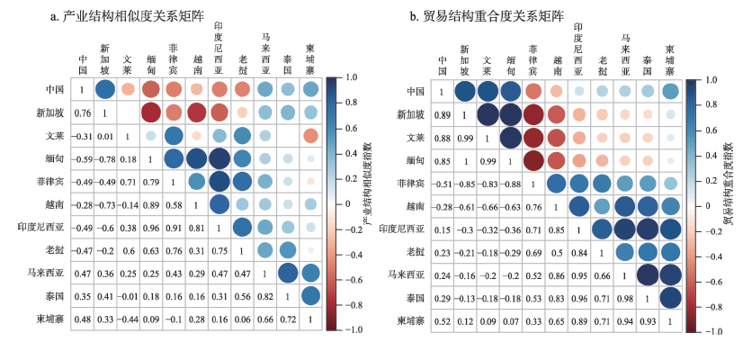 图4 2017年环南海区域国家产业结构和对外贸易结构关系矩阵注:中国数据不包括香港特别行政区、澳门特别行政区和中国台湾省的数据。 Fig. 4 Relationship matrix of industrial and foreign trade structure between countries of SCSR in 2017 |