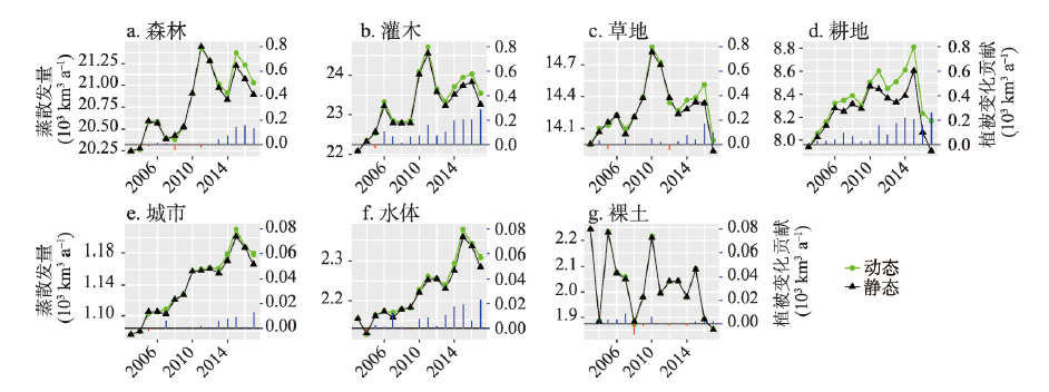 蒸散发是陆面水循环的关键环节和过程,是研究水循环对人类活动和气候变化响应的关键要素。过去十几年,全球下垫面的植被变化剧烈,但如何影响全球陆面蒸散发仍未得到清晰的揭示。本文采用500 m分辨率MODIS数据驱动PML-V2模型,定量解析了2003—2017年植被变化对全球陆面蒸散发的影响。结果显示:在全球尺度上,植被变绿使得全球蒸散发呈现显著的增加趋势,使陆地水循环加快;区域尺度上,植被变化对蒸散发的影响则存在明显的地带性和非地带性特征,如在北美洲中北部、欧洲、中国东部、非洲南部和澳大利亚东北部等地区,蒸散发总量的增加主要是由植被蒸腾增加而引起的。分析不同植被功能类型区的贡献显示,下垫面变化对灌木和耕地影响尤为明显,并在2012年以后呈现增强趋势;这2个植被类型区的全球年总蒸散发累积增加量为0.41×103 km3 a-1,约为黄河流域多年平均径流量的8倍。该研究结果有助于进一步加强关于下垫面变化对陆地水循环的影响及其可能带来的局部气候变化的认识。