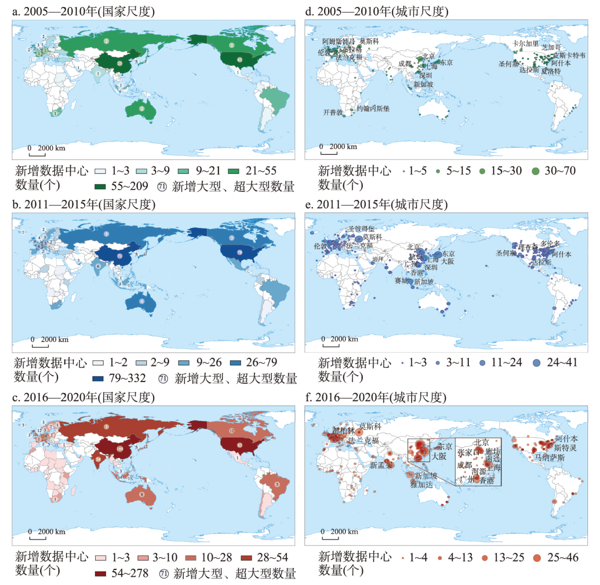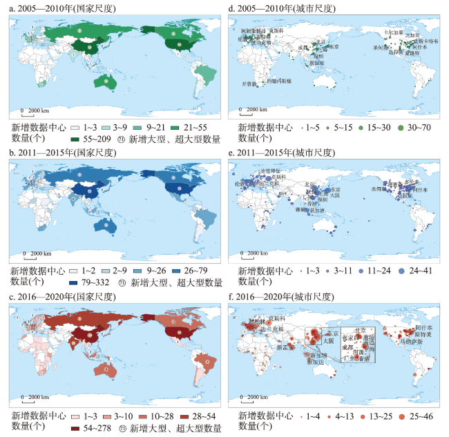 数字经济时代,新一轮信息技术革命对人类生产生活产生了复杂且深刻的影响,数据中心作为数据存储、分析、加工、应用的容器在全球数据价值链中的重要性日益凸显,成为全球数字化发展的有力支撑。在此背景下,厘清全球数据中心多尺度扩张规律及区位选择影响机制,指导数据中心在不同空间尺度下形成合理布局意义显著。为此,融合空间统计、空间分析、计量分析等方法,对2005—2020年全球数据中心扩张的空间特征与影响因素进行实证研究。研究发现:① 全球数据中心空间扩张态势明显,增长重心与经济重心同步系统性东移,全球尺度形成北美、西欧、东亚三大增长核心;城市尺度上,城市群、都市区是数据中心扩张的主要空间载体,形成北京、东京、上海等多个数据中心枢纽城市。② 多尺度空间扩张主要表现为邻近扩张、点状生长和聚集增长3种模式,在全球和城市尺度上形成“核心—边缘”、多核心结构等多种空间形态。③ 数据中心空间扩张的区位选择受市场规模、要素供给、运营环境的共同影响,但由于测量方式和空间尺度因素导致在国别和城市选择上存在一定差异。全球尺度受市场规模影响显著,要素供给和运营环境的影响表现出不同程度的阶段性特征;城市尺度受市场规模和要素供给、安全水平影响显著。