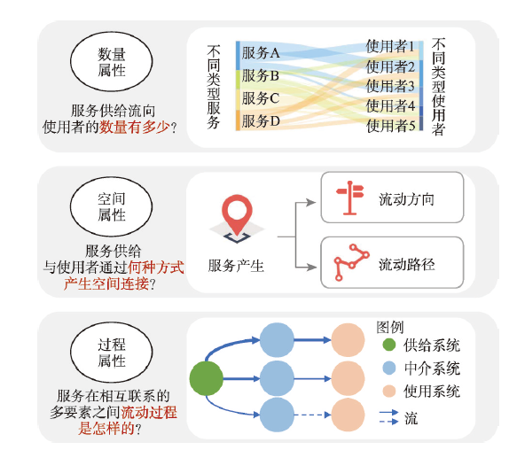 | 关注空间的流 | 强调生态系统服务供给和受益的空间连接 | 供需差异法:考虑空间距离,认为服务由供大于需的区域就近流向供不应求的区域,通常借助引力模型和基于DEM的水流动模型刻画服务流的空间流动路径,优势是能够在考虑距离条件下直观连接供给与需求,但对多元影响因素的考虑仍存在不足。 节点连接法:将特定服务的供给和受益区抽象为供需节点,基于载体在节点间的流动表征服务的流,较好兼顾流量和流向,但获取全面的载体属性较难,因此适用的服务类型较少。 固定路径法:通过河道和路网传递服务,如文化服务受益者随公路或飞机航线移动,与水有关的服务被视为沿河道传递等,固定路径的还原有助于刻画更清晰的服务流动方向,但适用的服务类型较少。 | [33]、[42]、[45] |