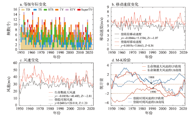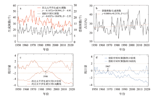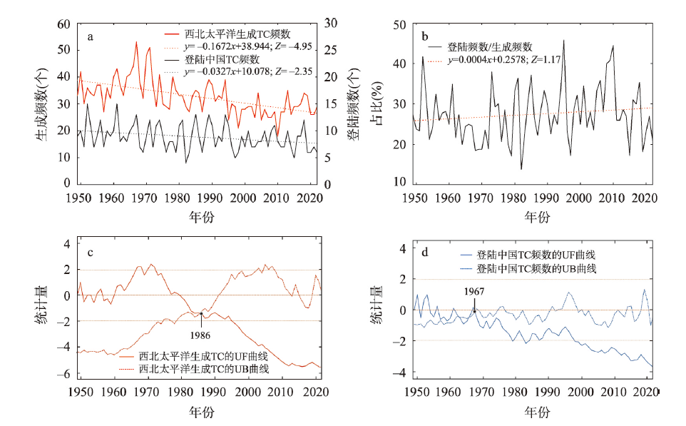 图1 1949—2022年西北太平洋生成热带气旋和登陆中国热带气旋频数、登陆频数占比及生成热带气旋频数和登陆热带气旋频数的M-K检验Fig. 1 The interannual variation of the frequency of generating and landing tropical cyclones over China, the proportion of landing frequency to the total number of generating tropical cyclones, M-K test for generating tropical cyclone frequency and landing tropical cyclone frequency from 1949 to 2022 |