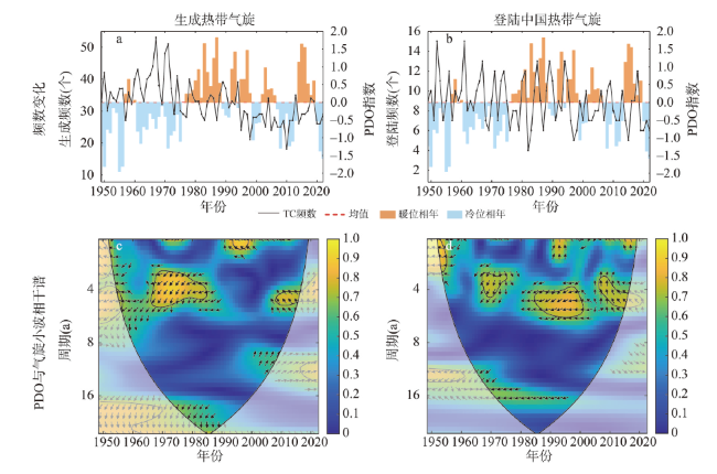 20世纪以来,热带气旋活动在全球气候变暖背景下发生了明显变化,登陆中国热带气旋的特征和趋势如何变化仍需进一步明确。基于中国气象局热带气旋最佳路径数据集资料,分析了1949—2022年登陆中国热带气旋的时空特征及变化趋势,并探讨了厄尔尼诺—南方涛动(ENSO)和太平洋年代际振荡(PDO)对登陆热带气旋活动的影响。结果表明:① 年均登陆中国的热带气旋约8.85个,总体呈显著减少趋势且随纬度降低降幅增大,但登陆热带气旋占生成总数的比例以及台风及以上等级热带气旋登陆占比均有增加;7—9月登陆中国热带气旋的数量占全年的76.3%,其中8月份最多。② 空间特征上,热带气旋登陆中国的位置主要集中在18°N~26°N,约占总数88.2%,30°N以北区域登陆的热带气旋频数锐减;登陆热带气旋的生成位置重心向西北方向移动趋势显著,愈加靠近中国,2010—2022年热带气旋生成位置的重心相比1949—1969年西移4.5个经度、北移2.0个纬度。③ ENSO与生成和登陆中国热带气旋频数的年际变化存在相关性,厄尔尼诺年促进了强热带气旋的形成,并且使得登陆热带气旋的生成位置更加偏向东南,拉尼娜年则相反;PDO也在一定程度上影响了热带气旋的生成,当处于PDO的暖位相时,生成热带气旋的数量较冷位相偏少且位置偏西。本文进一步厘清了1949年以来登陆中国热带气旋特征的变化趋势,并揭示了ENSO和PDO对热带气旋活动的影响,研究结果可为开展热带气旋模拟评估和防风减灾工作提供科学依据。