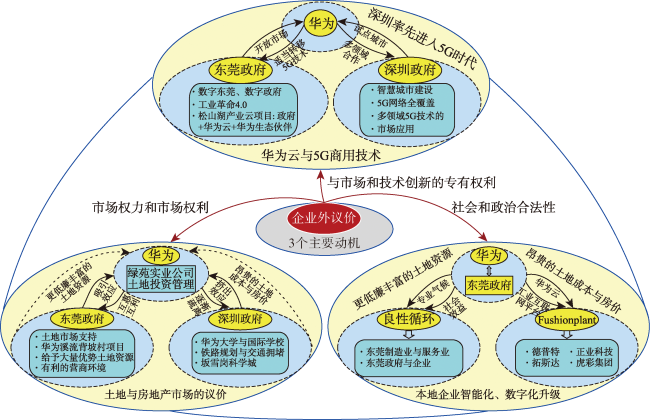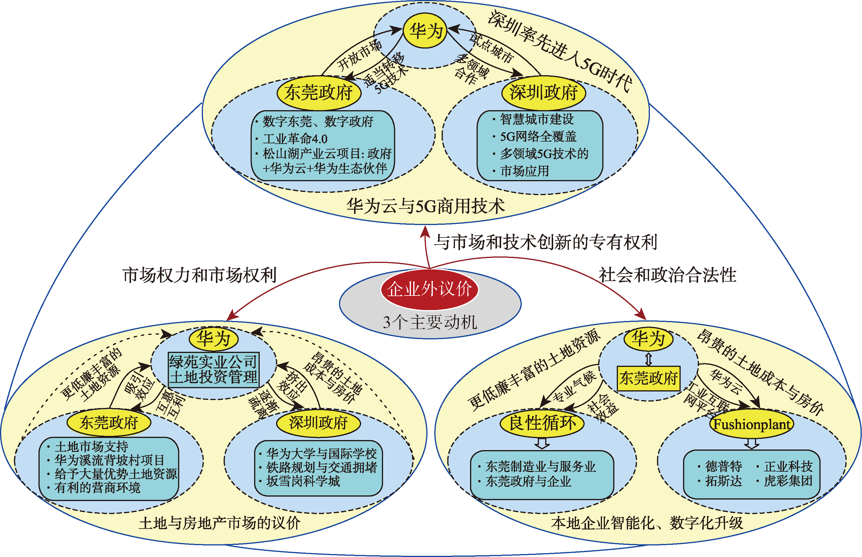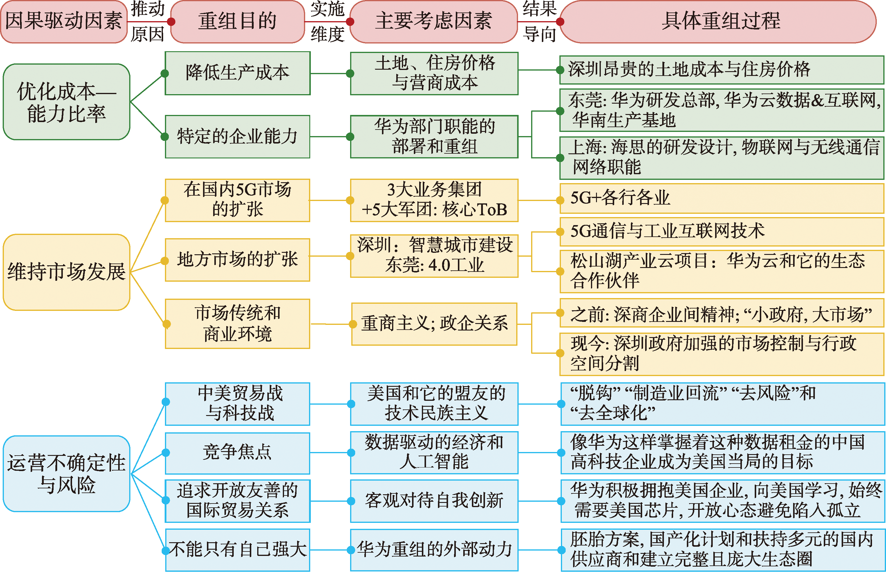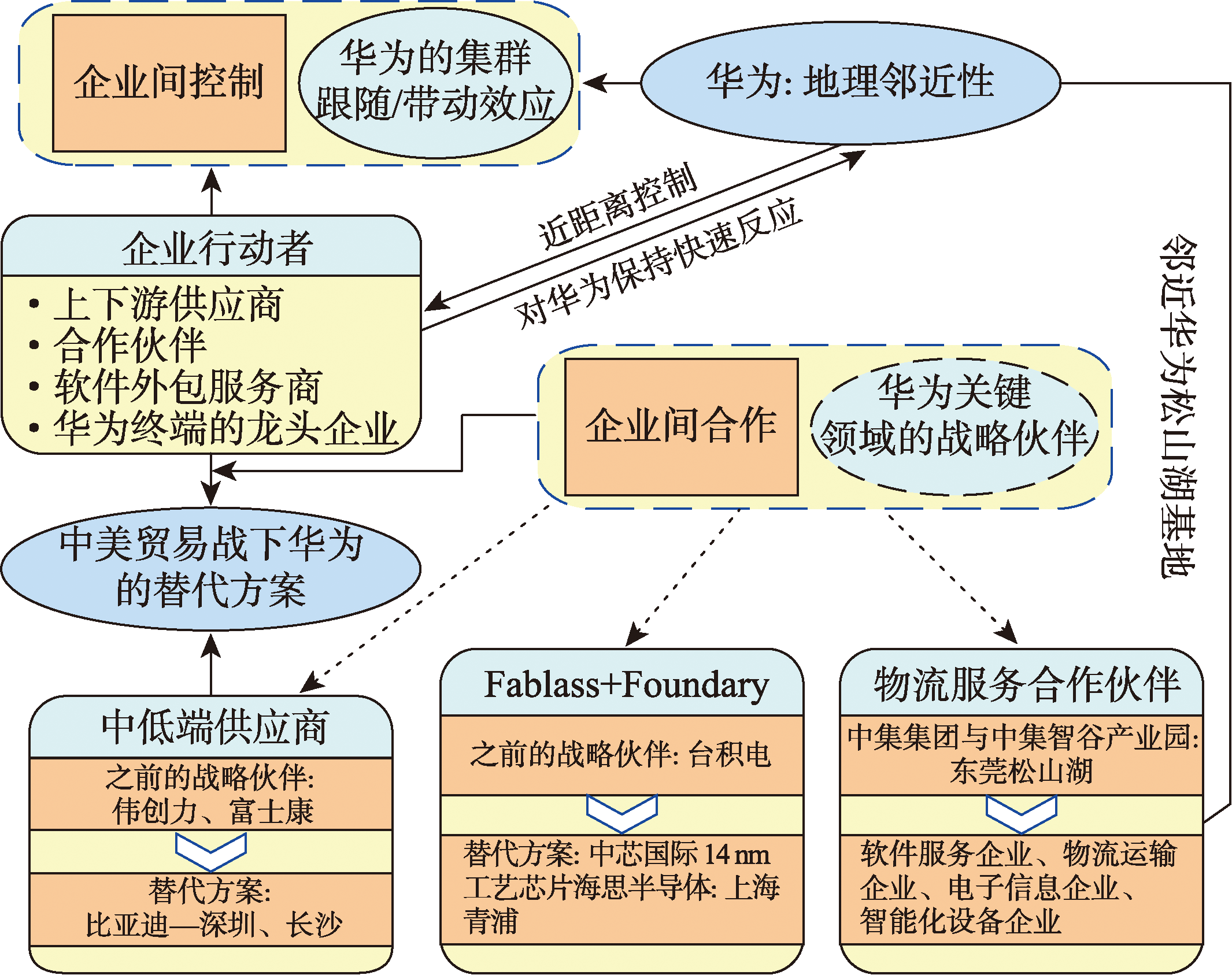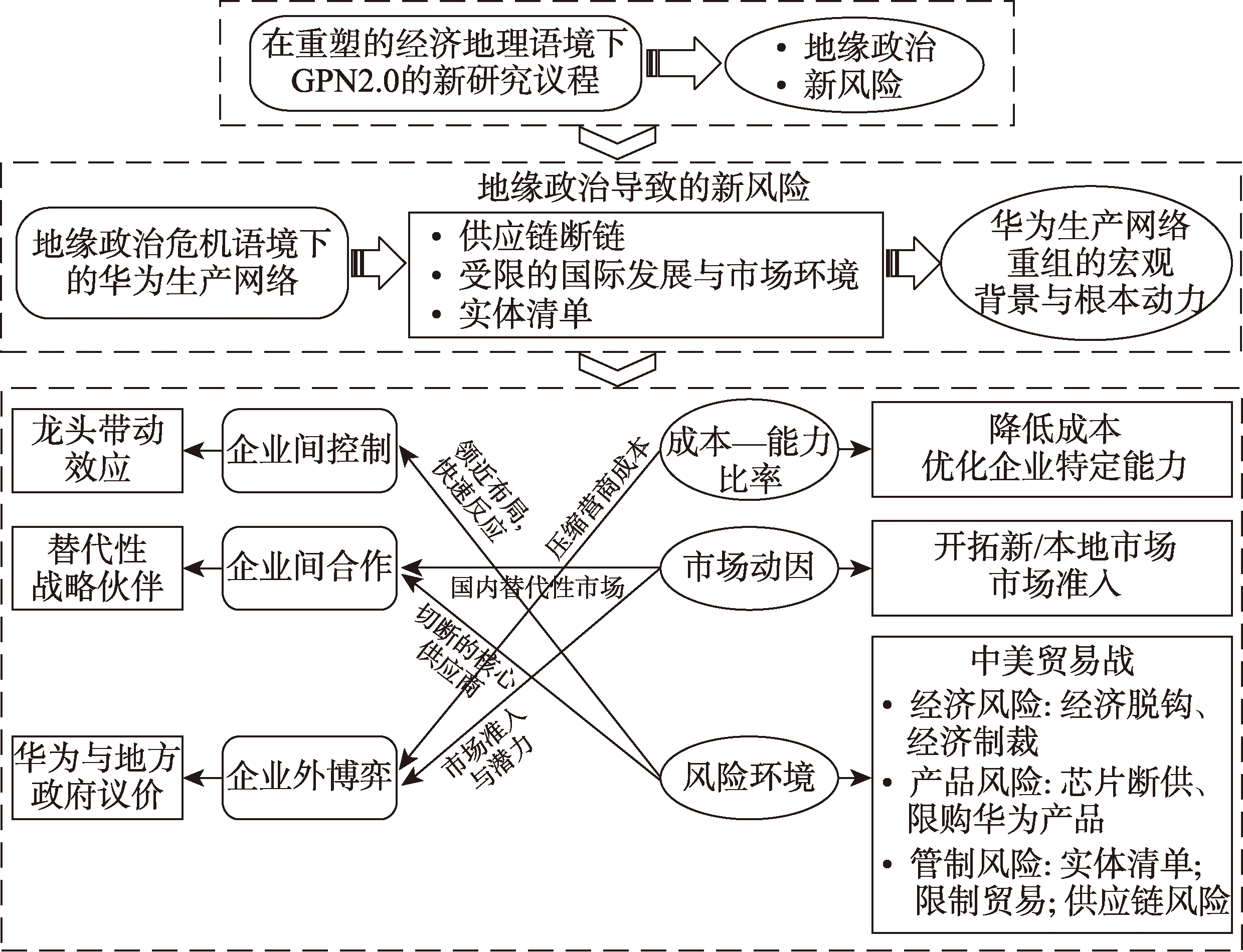 在中美贸易战全球地缘政治危机背景下,地缘政治与新风险的互动成为GPN 2.0研究的新方向,研究领先企业的全球生产网络的重构进程、战略反应和完整的因果解释动态具有现实和理论意义。本文利用2023年在上海、深圳、东莞调研的华为及其供应商32家企业访谈数据,研究了在当下中美地缘政治危机中最首当其冲的领先企业华为,从全球生产网络向部分国内生产网络的重构过程,尤其关注了它由深圳向东莞的产业再转移过程中的空间逻辑、区域再布局、行动动者策略和因果驱动机制。研究发现:① 华为重组的行动者战略主要有3种,一是基于龙头企业带动效应的企业间控制,二是寻求替代性战略伙伴的企业间合作,三是华为与深圳、东莞地方政府议价的企业外博弈战略。重组的焦点分别围绕着地理邻近性、战略联盟的国产替代、土地与房地产、5G市场展开;② 华为重组的动态因子有3种,一是成本—能力比率,主要考虑到降低土地成本和重新优化研发总部、华为南方生产基地、人才培训和员工配套职能;二是市场动因,以ToB为核心开拓国内新的5G市场,形成3大业务集团+5大军团模式,以深圳和东莞的智慧城市项目为主开拓本地市场;三是中美贸易战的风险环境推动了华为扶持国内多元产业链条;③ 华为重组的行动者战略与因果机制有着紧密的互动,风险环境驱动华为的企业间控制,市场动因和风险环境影响华为的企业间合作,优化成本—能力比率和挖掘5G/房地产市场又是华为与地方政府企业外博弈的核心。