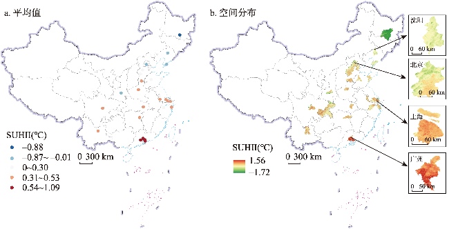 表3 2018年全国超大、特大城市SUHII的统计特征Tab. 3 Mean, maximum, minimum, range and standard deviation of SUHII for China's super- and mega-cities in 2018 |