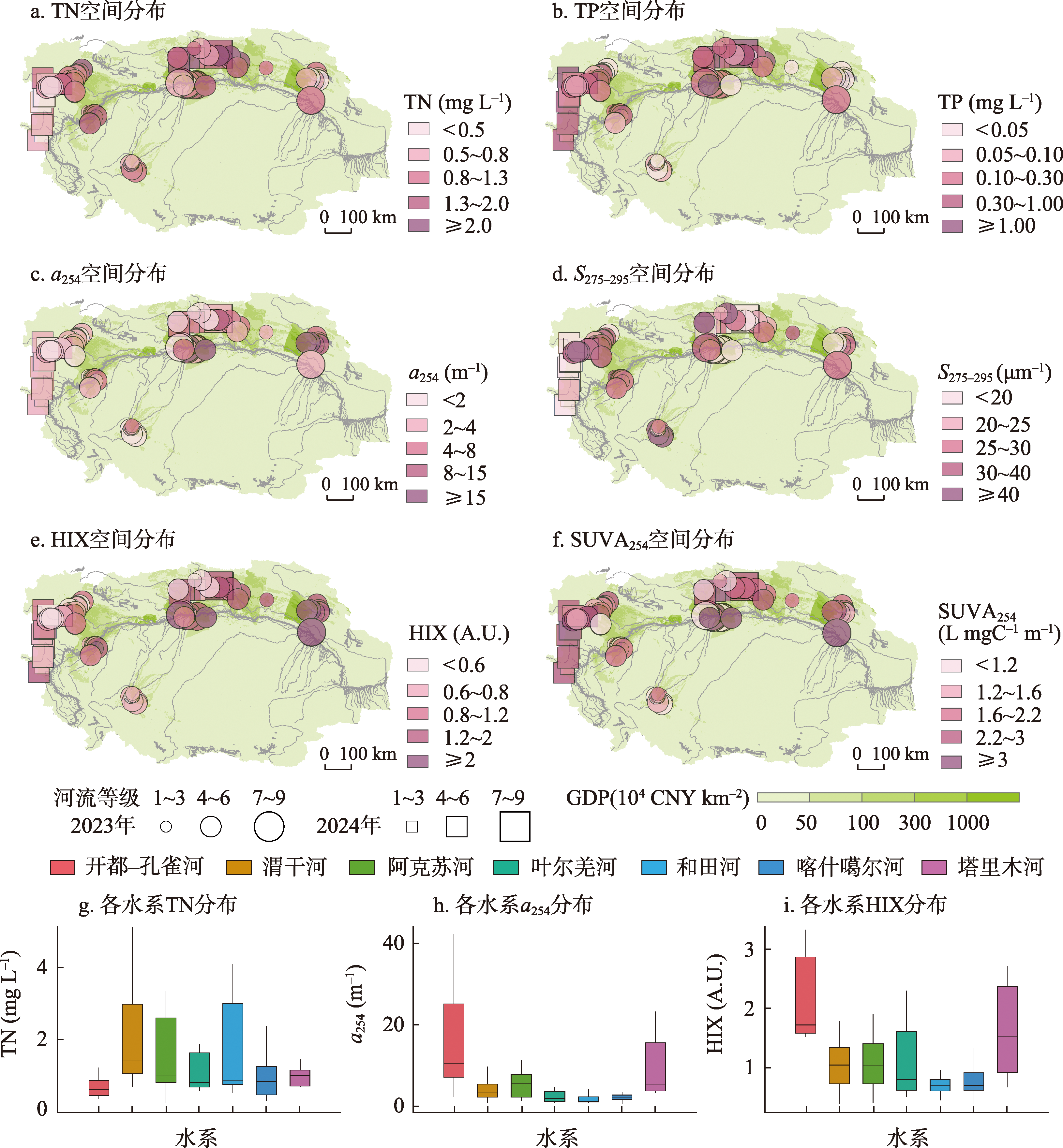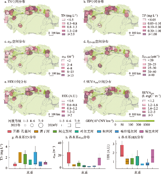 图3 塔里木河流域总氮、总磷、DOM吸收系数、DOM光谱斜率、腐殖化指数和比紫外吸收的空间分布特征和TN、a254、HIX在塔里木河流域7大水系分布的箱线图Fig. 3 Spatial distribution of total nitrogen, total phosphorus, DOM absorbance, DOM spectral slope, humification index, and specific UV absorbance in the Tarim River Basin and boxplots of TN, a254, HIX for the seven major water systems of the Tarim River Basin |