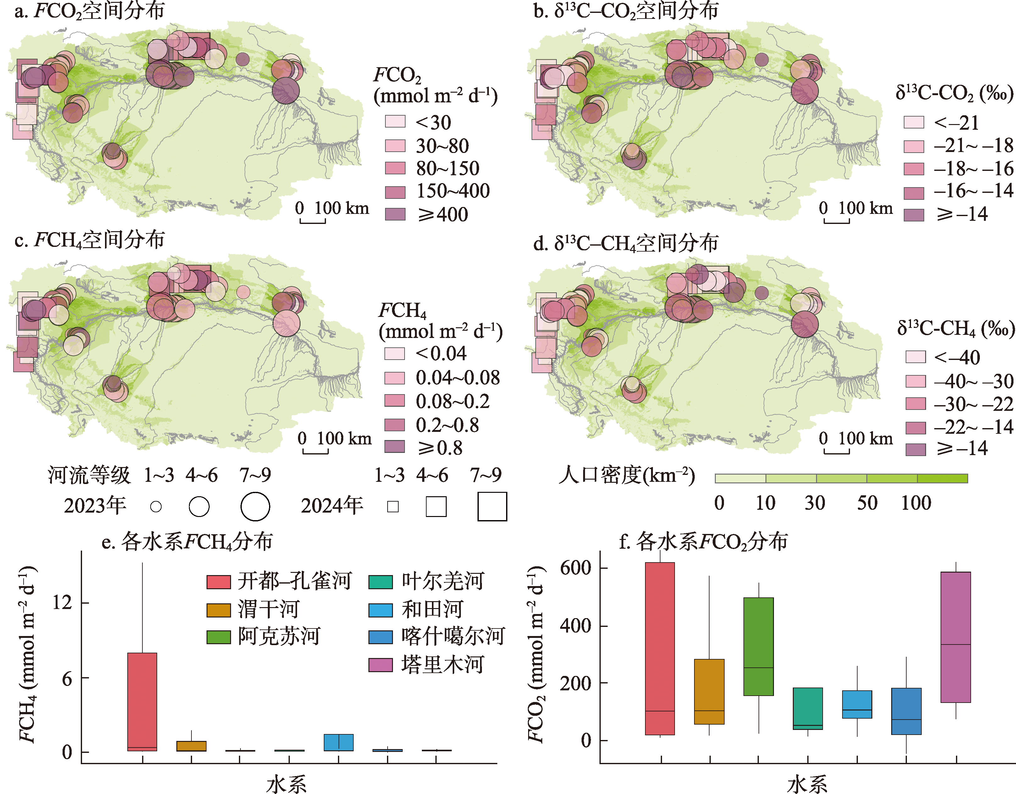 图4 塔里木河流域二氧化碳通量(FCO2)、CO2稳定碳同位素(δ13C-CO2)、甲烷通量(FCH4)、CH4稳定碳同位素(δ13C-CH4)空间分布特征和FCH4、FCO2在塔里木河7大水系分布的箱线图Fig. 4 Spatial distribution of CO2 efflux (FCO2) and its stable isotope signatures (δ13C-CO2), and CH4 efflux (FCH4) and its stable isotope signatures (δ13C-CH4) in the Tarim River Basin and boxplots of FCH4, FCO2 for the seven major water systems of the Tarim River Basin |