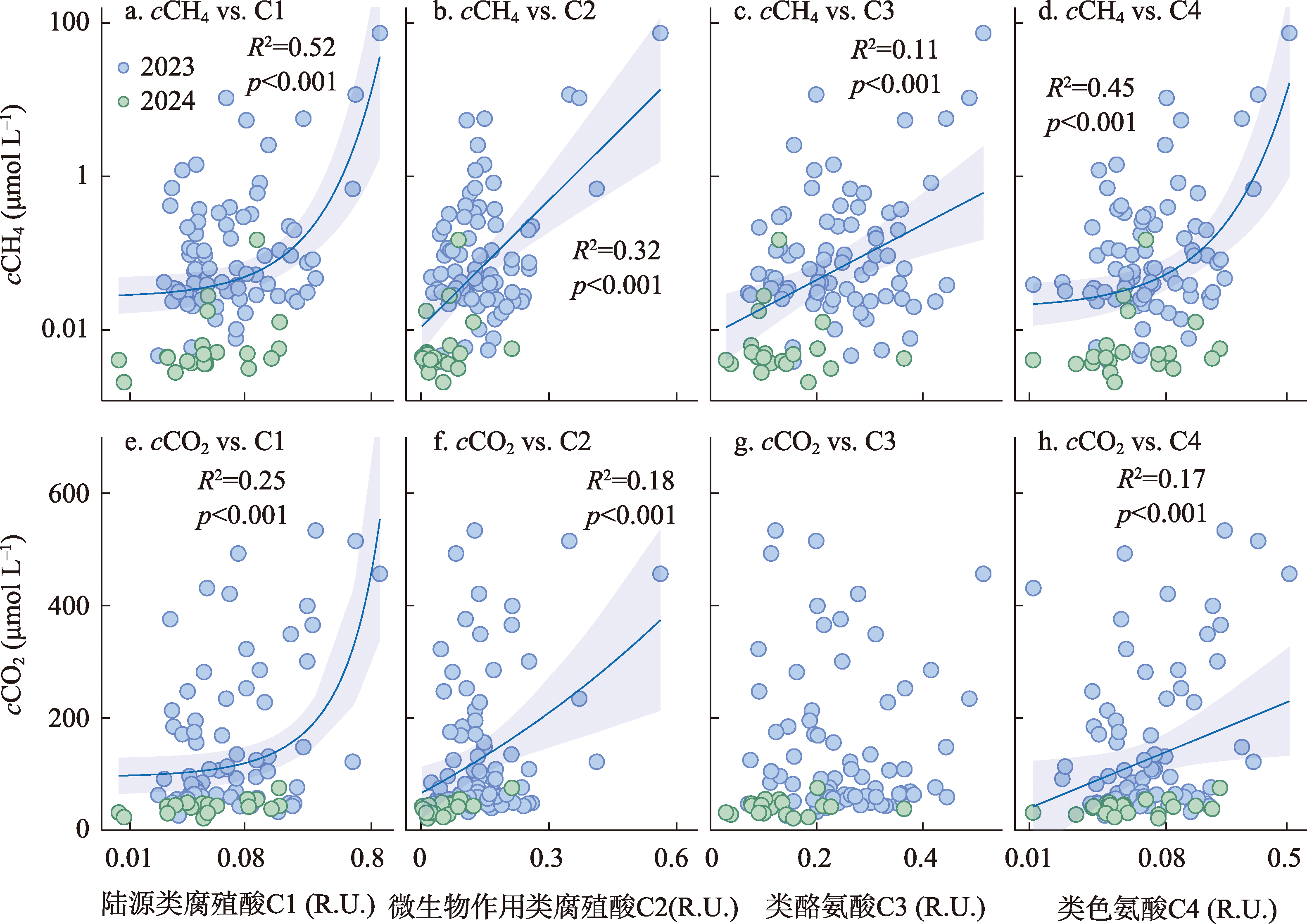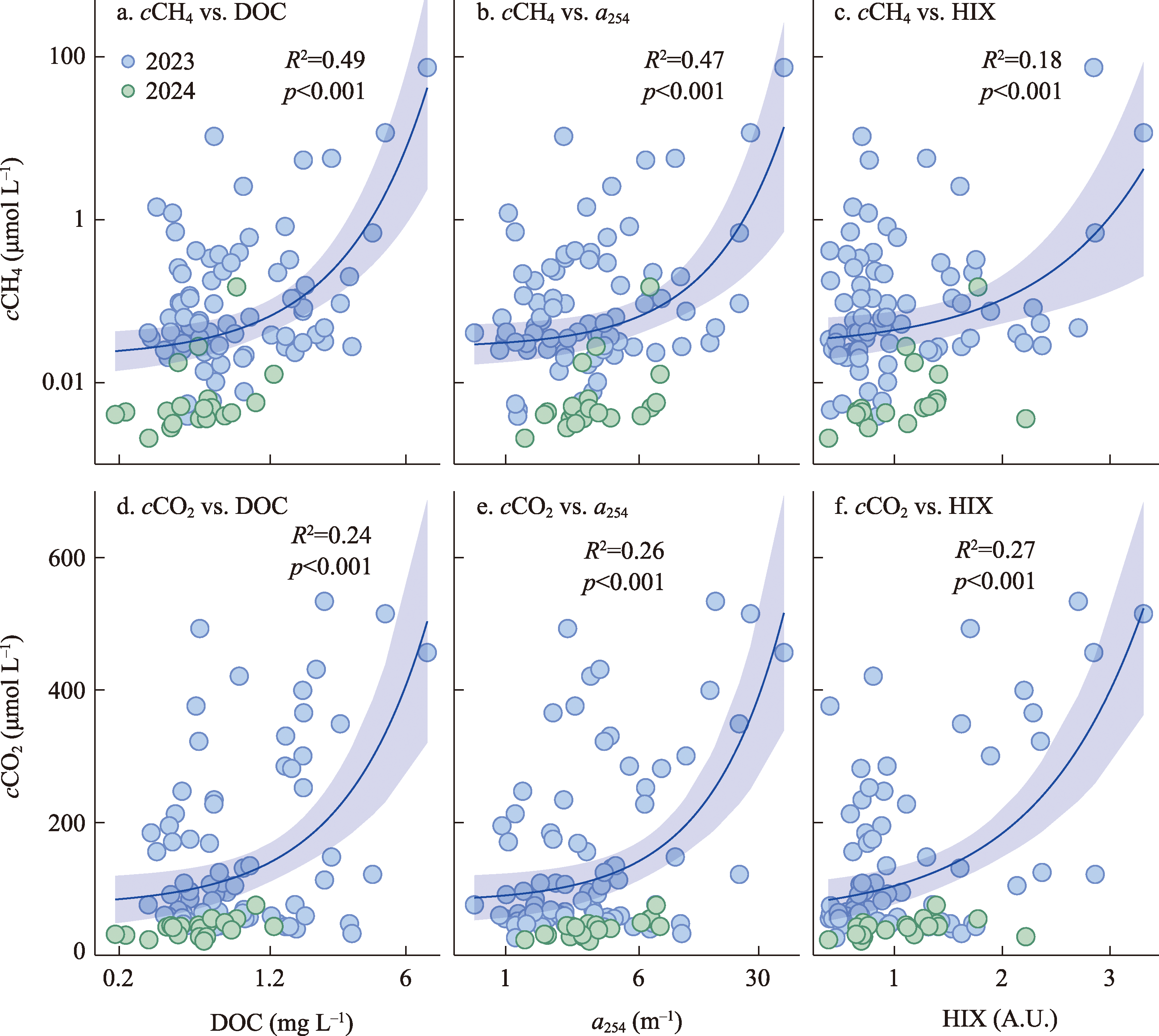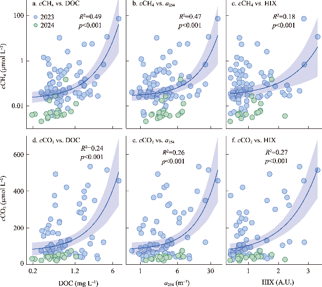 图5 塔里木河流域甲烷浓度、二氧化碳浓度与溶解性有机碳、DOM吸收系数和腐殖化指数的相关关系Fig. 5 Relationships between CH4 (cCH4) and CO2 (cCO2) concentrations and dissolved organic carbon (DOC), DOM absorbance (a254), and humification index (HIX) in the Tarim River Basin |