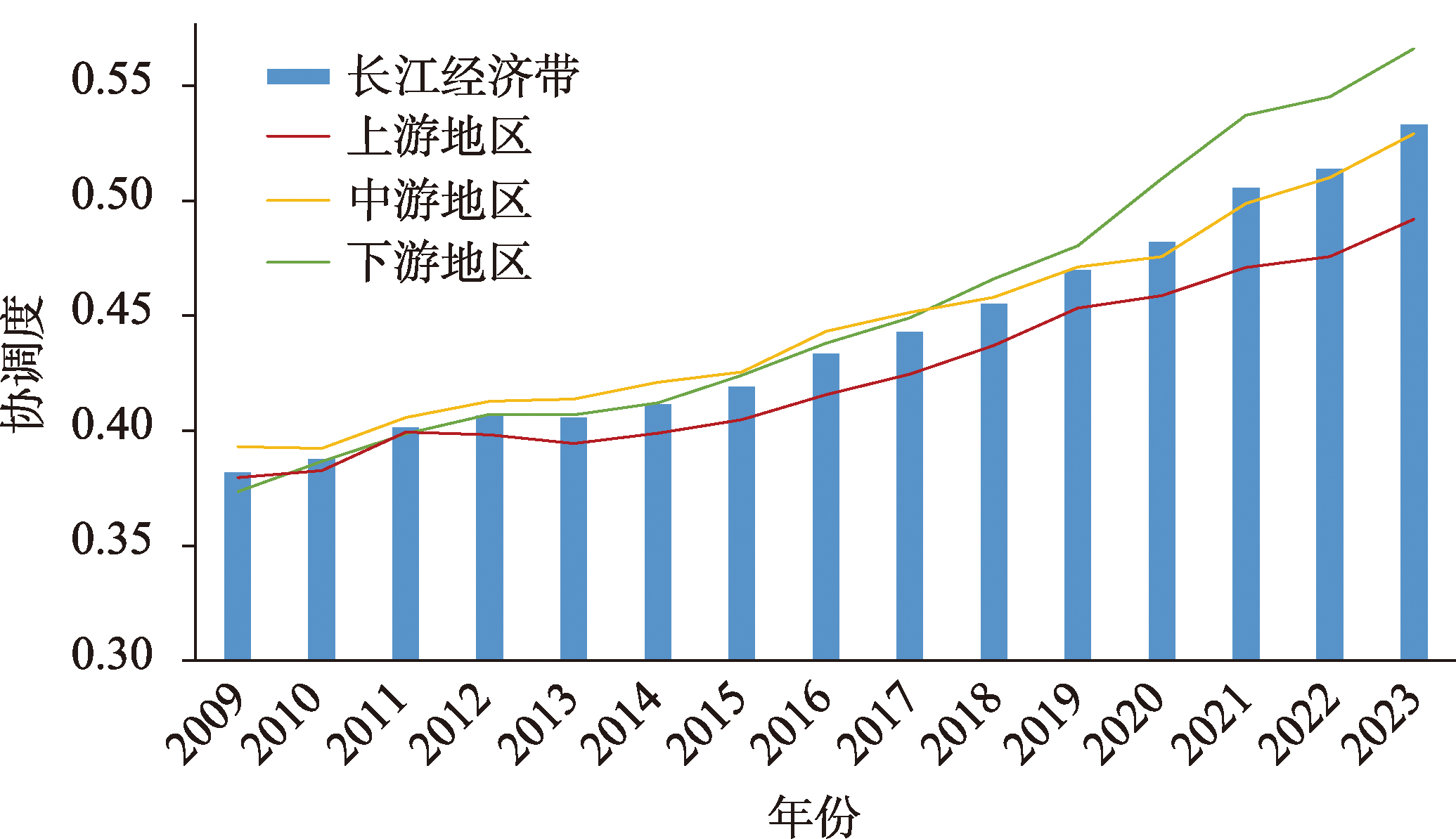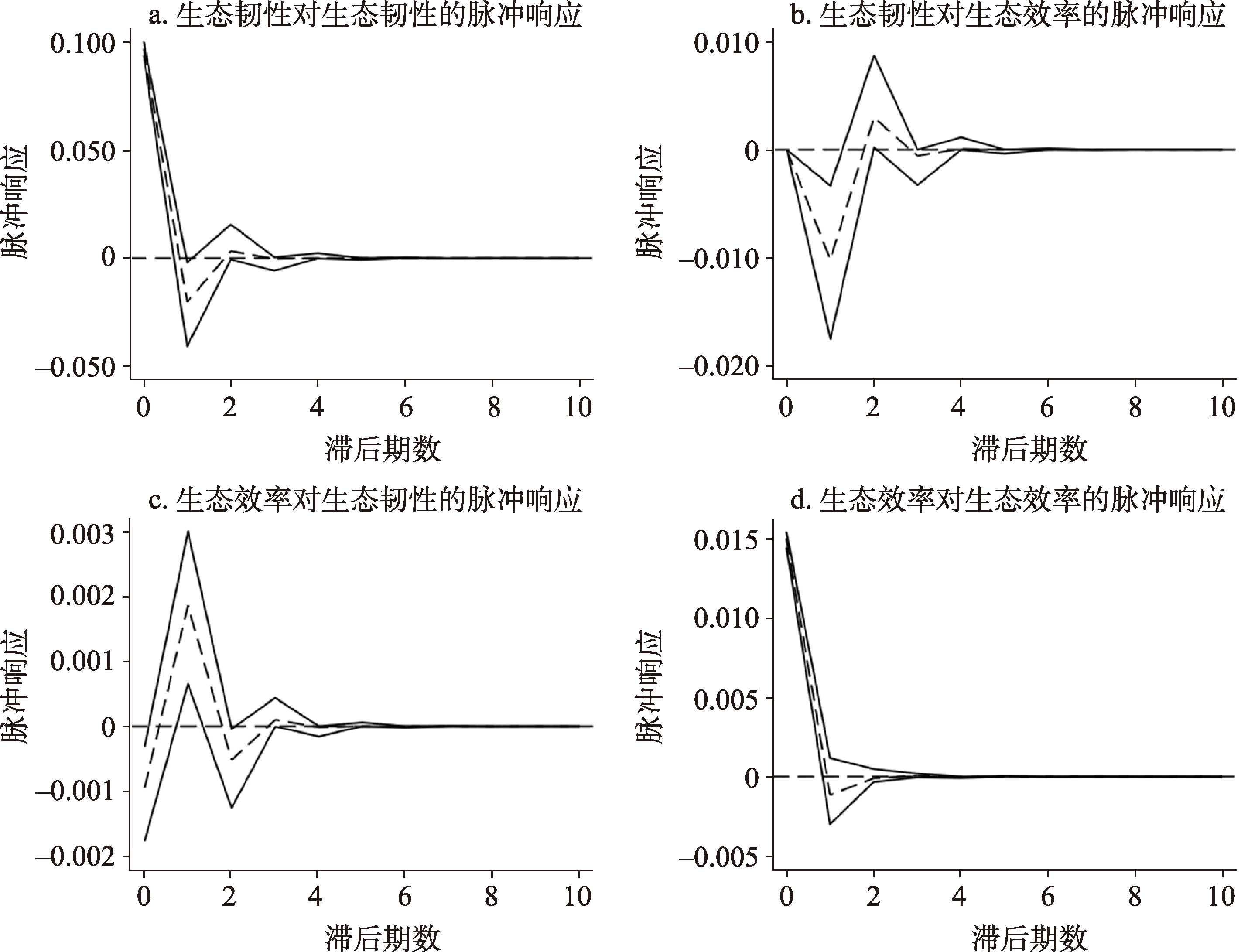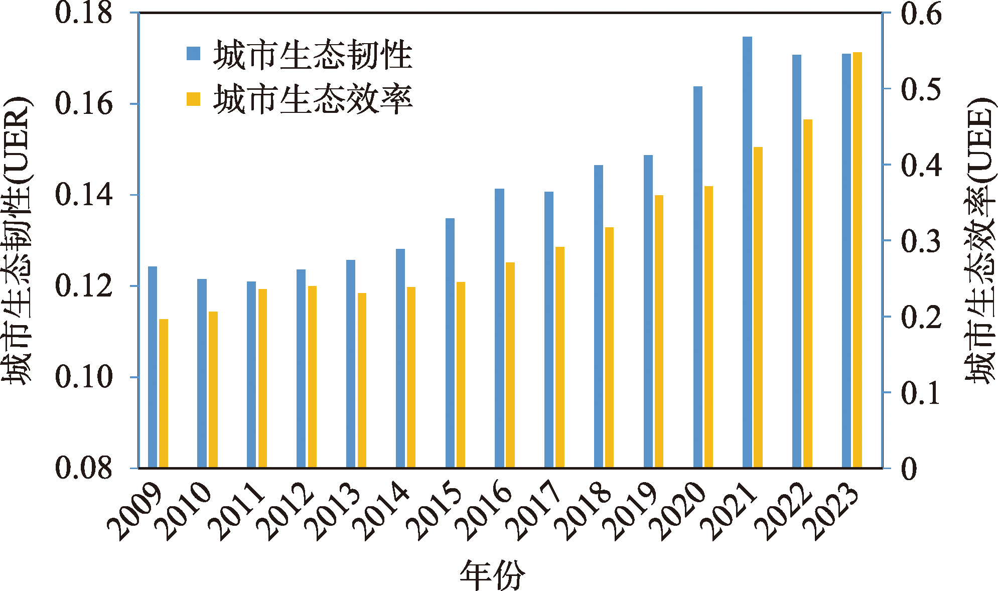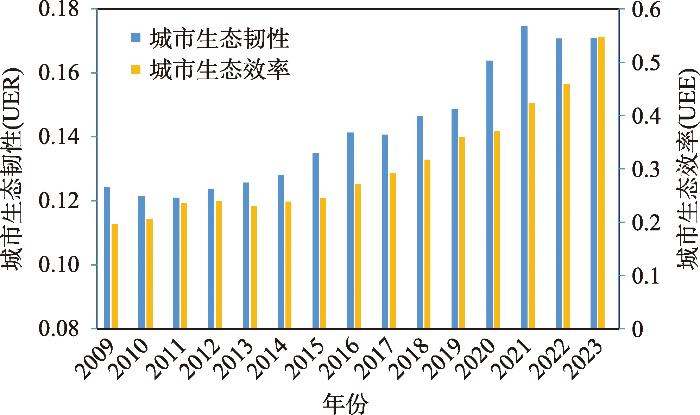 本文以长江经济带107个地级及以上城市为研究样本,采用耦合协调度模型、空间自相关模型与面板向量自回归模型,分析了其2009—2023年生态韧性与生态效率的协调性及互动效应。结果表明:① 2009—2023年长江经济带城市生态韧性呈现出波动上升的趋势,由2009年的0.1242上升至2023年的0.1709,年均增长率为2.31%;在空间上展现出“南高北低”的格局特征。城市生态效率呈现逐年上升的特征,由2009年的0.1960上升至2023年的0.5475,年均增长率为7.61%;在空间上展现出“下游地区>中游地区>上游地区”的格局特征。② 长江经济带城市生态韧性与生态效率的协调度波动上升,由2009年的0.3818上升为2023年的0.5329,年均增长率为2.41%;且呈现出“下游地区>中游地区>上游地区”的空间格局特征。③ 长江经济带城市生态韧性与生态效率的协调度存在空间正相关,但集聚强度呈衰减趋势,具体表现为,上游地区新兴集聚区萌发,而下游地区集聚范围呈收缩态势,特别是安徽地区低—低集聚区大幅缩减。④ 长江经济带城市生态韧性与生态效率存在动态交互效应。二者互为Granger因果关系,对彼此的影响呈波动态势,但整体仍是积极影响,而相较于彼此的交互影响作用,城市生态韧性与生态效率对各自的影响效应更强。