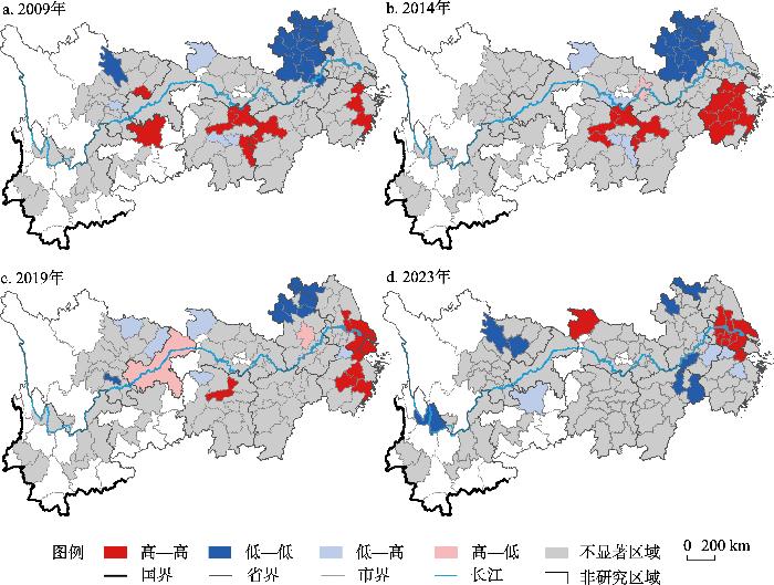 表3 长江经济带城市生态韧性与生态效率协调度的Moran's I统计量Tab. 3 Moran's I statistic of the coordination degrees between urban ecological resilience and eco-efficiency in the Yangtze River Economic Belt |