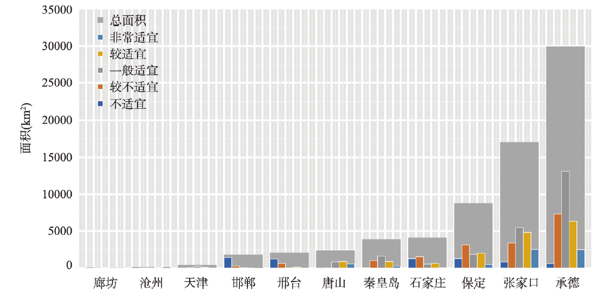 京津冀各类光伏开发适宜区在不同地市的面积统计