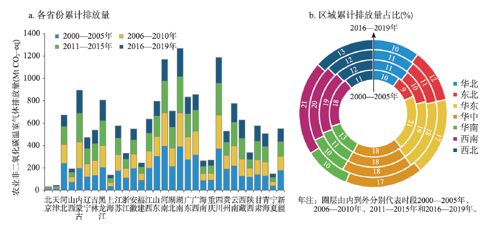 2000—2019年各省与各区域农业源非二氧化碳温室气体分时段累计排放量