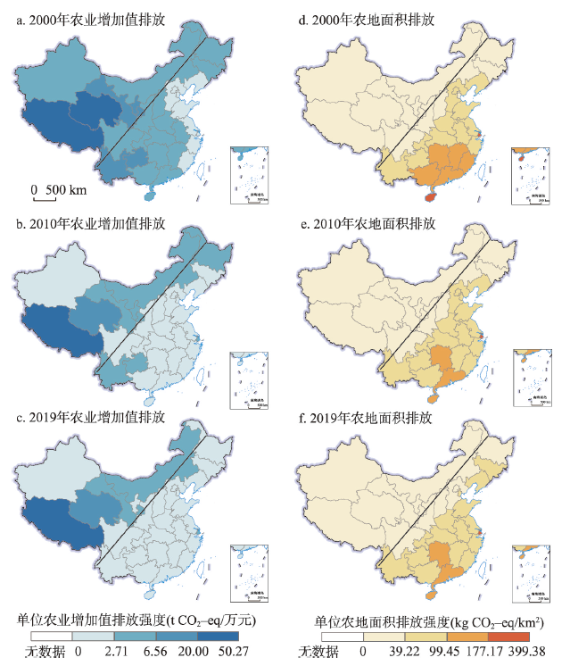 2000—2019年各省单位农业增加值与单位农地面积农业源非二氧化碳温室气体排放强度