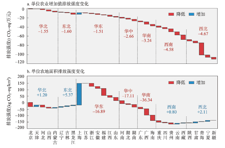 2000—2019年各省份单位农业增加值与单位农地面积农业源非二氧化碳温室气体排放强度变化