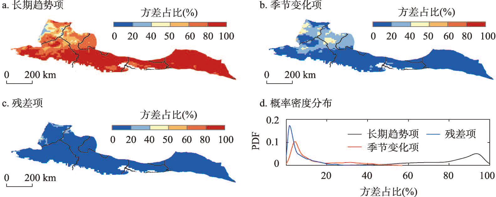 长期趋势项、季节变化项和残差项的方差占比与概率密度分布