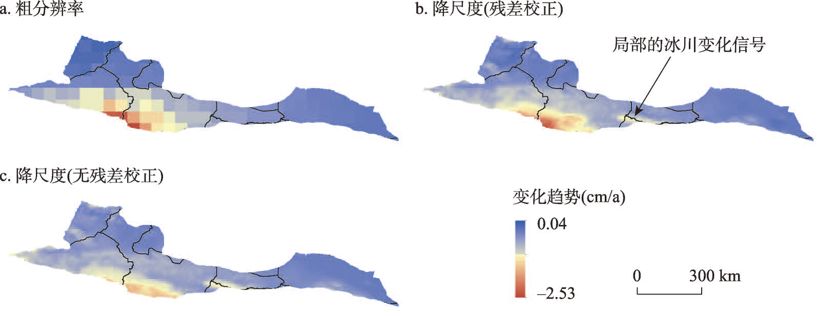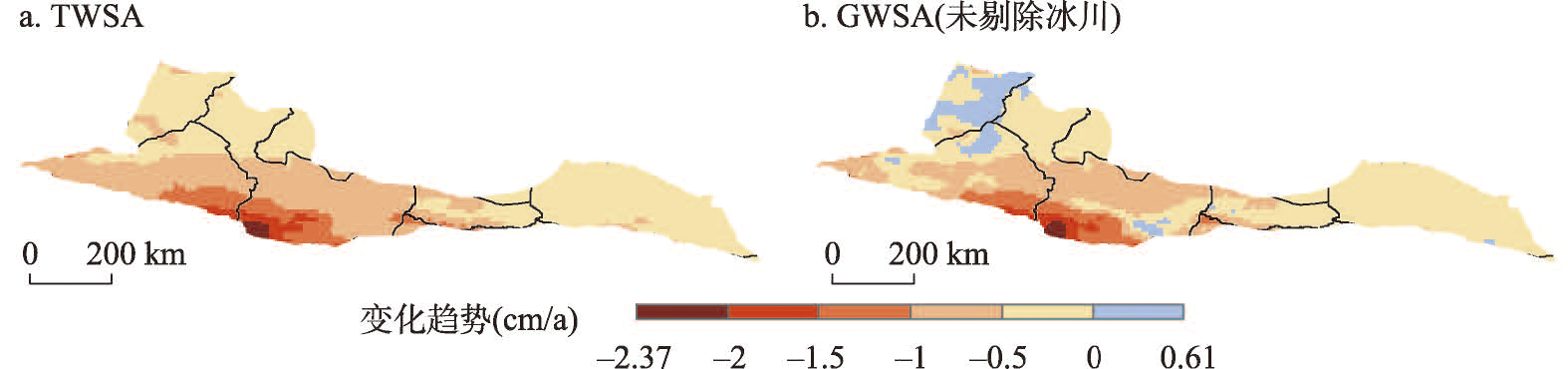 TWSA和未剔除冰川情况下GWSA变化趋势的空间分布