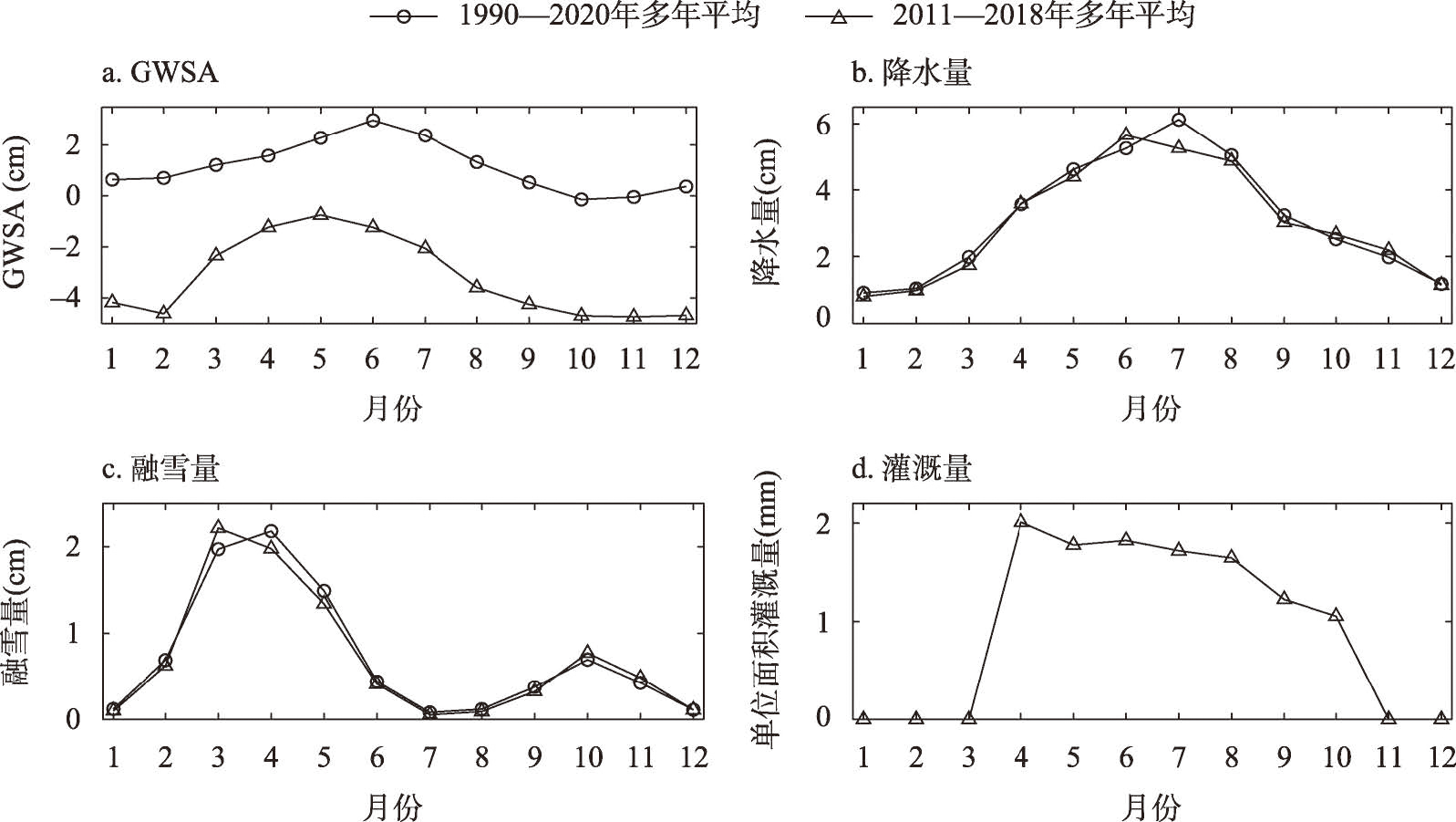 天山北坡GWSA、降水量、融雪量和灌溉量的季节变化