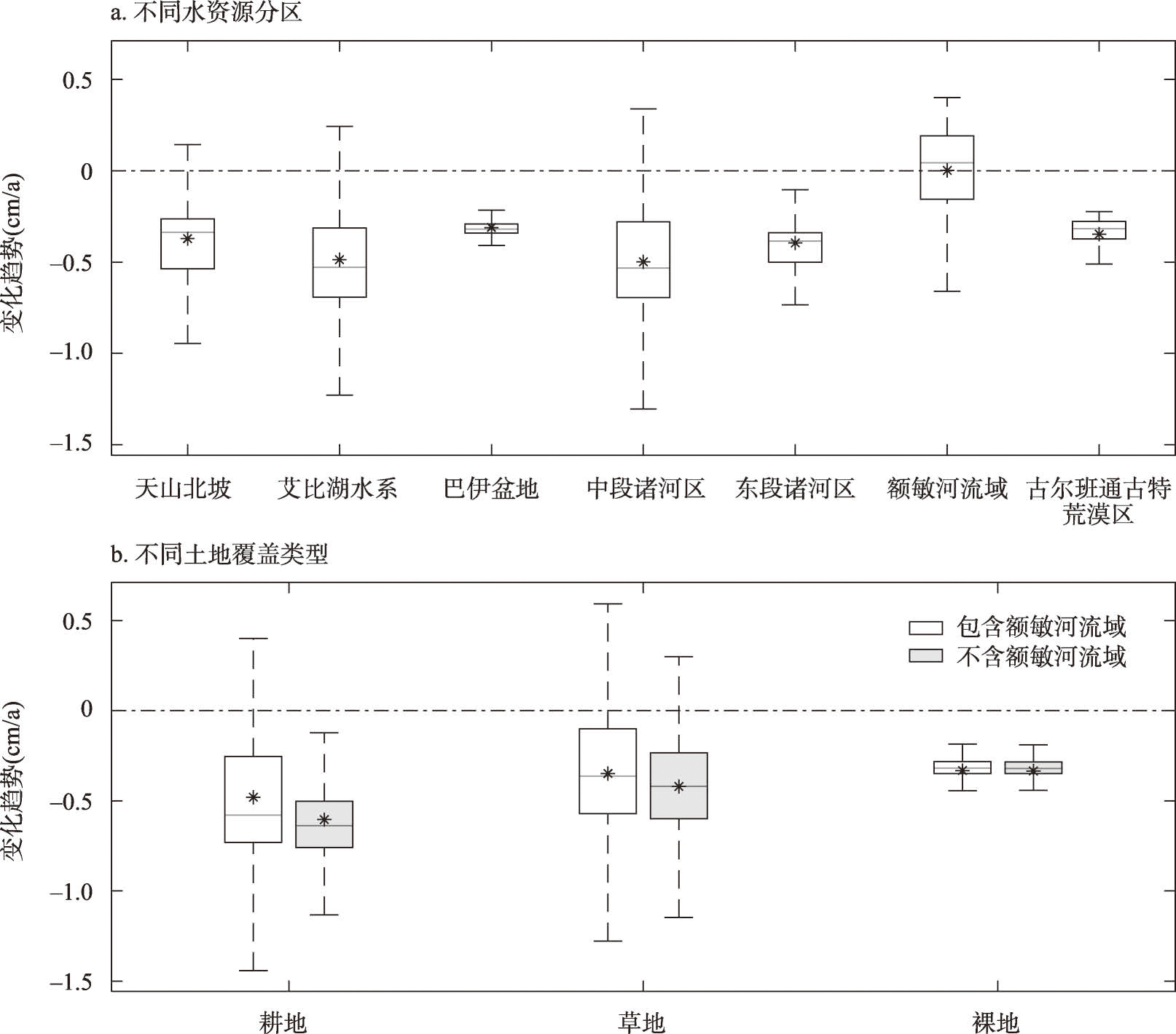 不同水资源分区和土地覆盖类型的GWSA变化趋势