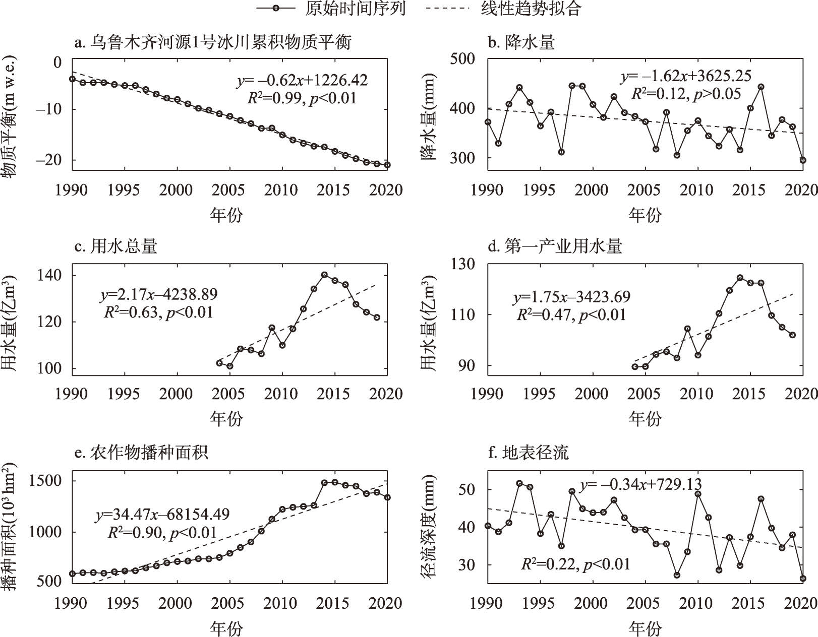 天山北坡冰川物质平衡、降水量、用水量、农作物播种面积和地表径流的年际变化