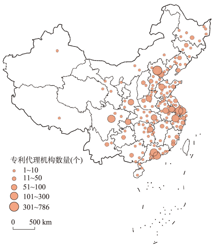 2001—2018年高层级服务城市的服务半径与专利代理服务量散点图