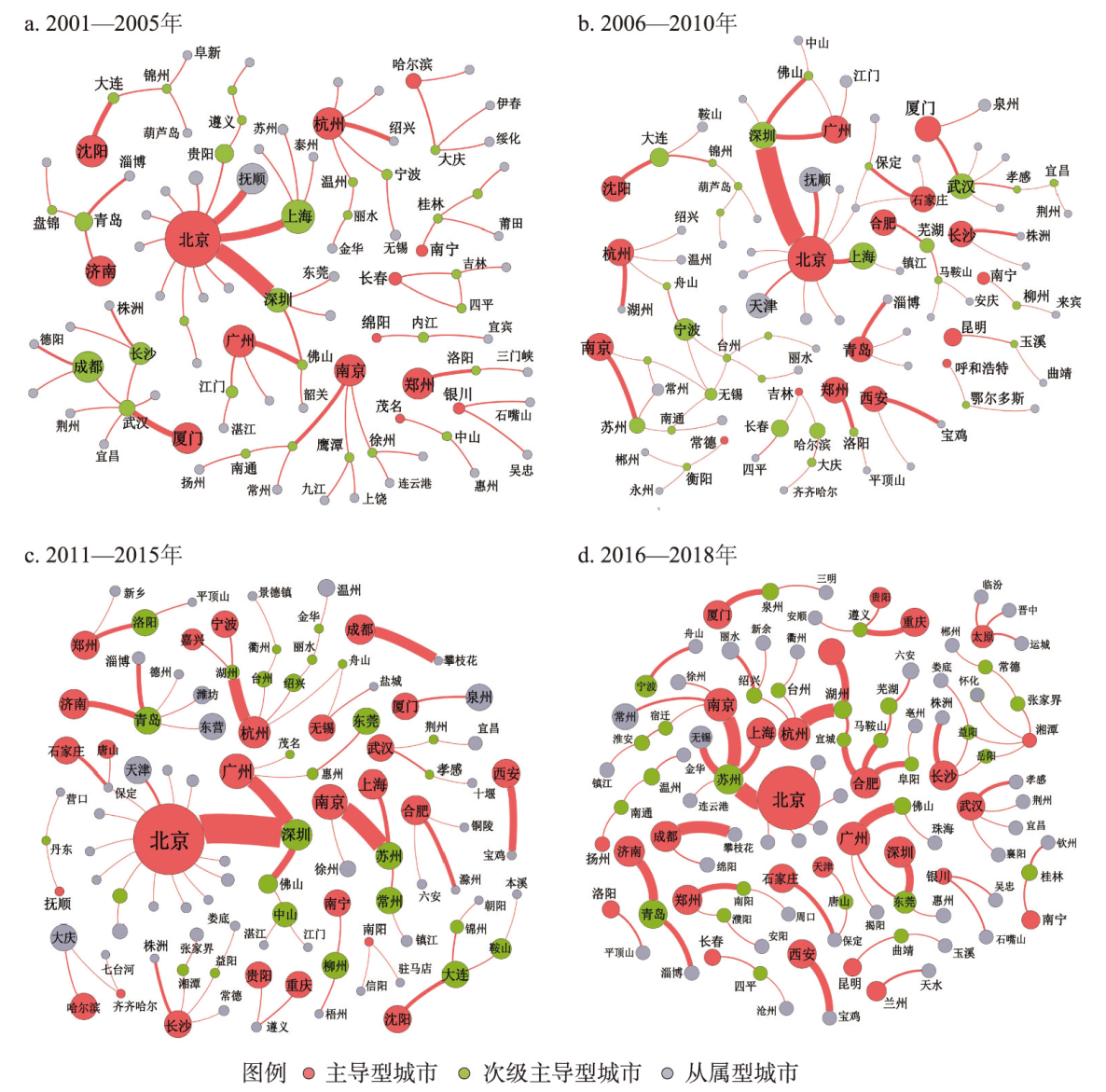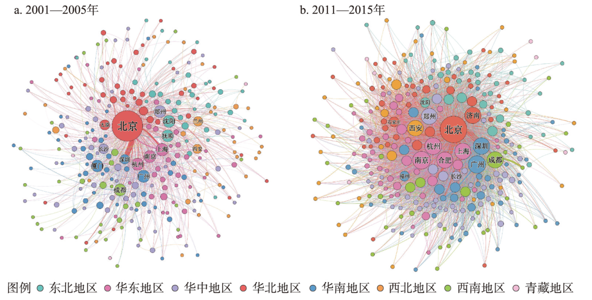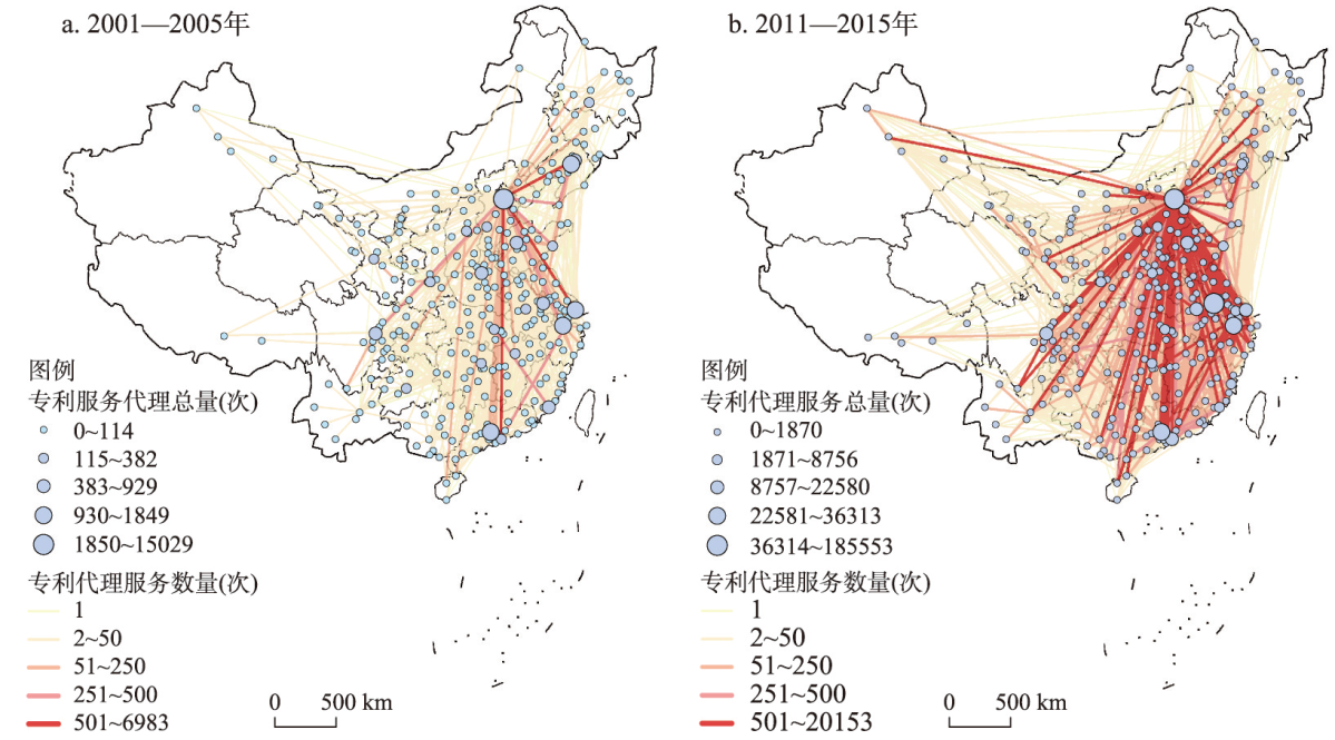 2001—2005年和2011—2015年中国专利代理服务网络的空间流向
