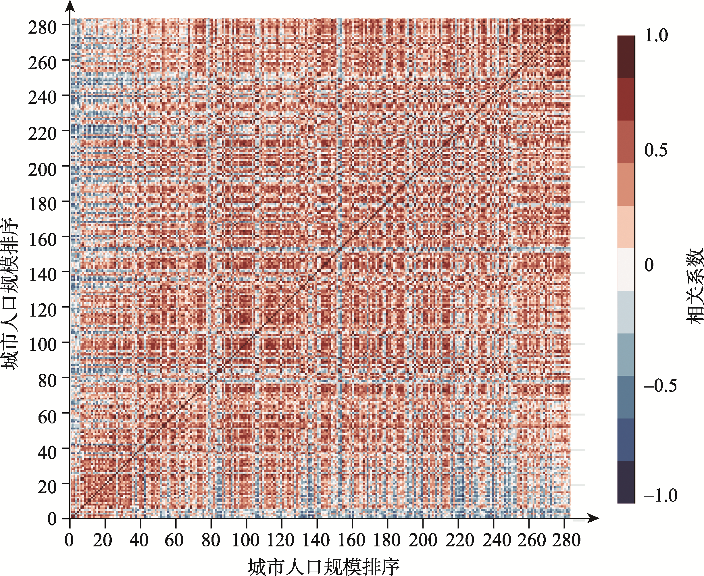 注:根据城市人口规模从大到小排序,并计算2006—2019年任意两个城市之间19个产业的平均区位商(向量)间的皮尔逊相关系数,颜色越深代表相关性越强,红色表示正相关,蓝色表示负相关。