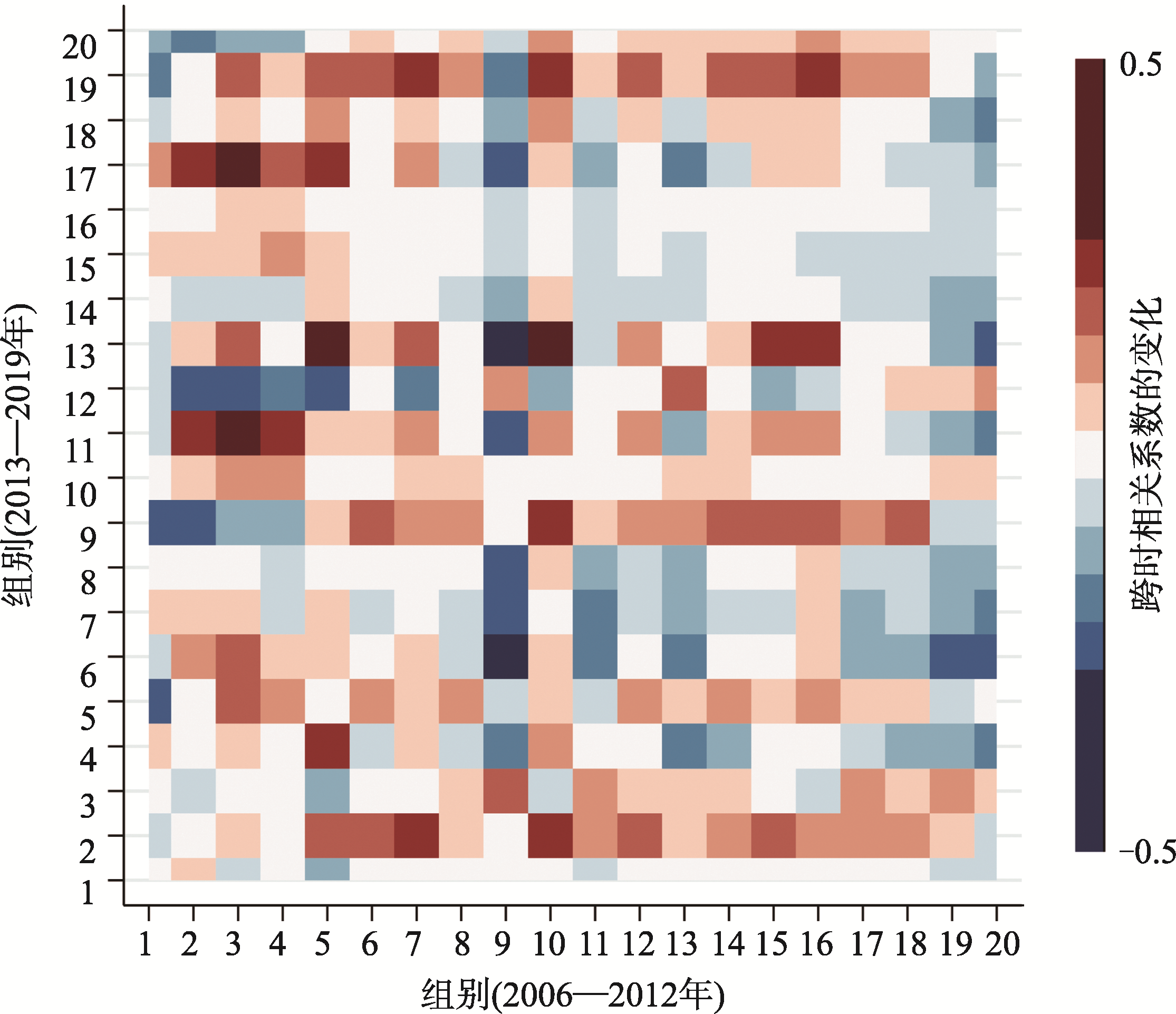 注:横轴表示2006—2012年按城市人口规模(2006年)划分的20组,纵轴表示2013—2019年的20个组,点表示2013—2019年与2006—2012年城市组间的19个产业的平均区位商(向量)间的皮尔逊相关系数与2006—2012年城市组间产业平均区位商的皮尔逊相关系数之差。