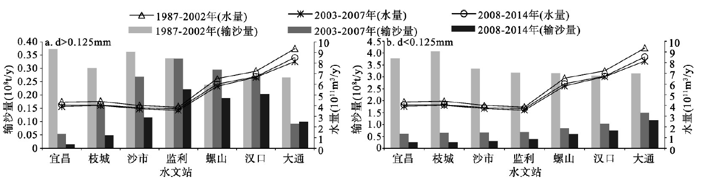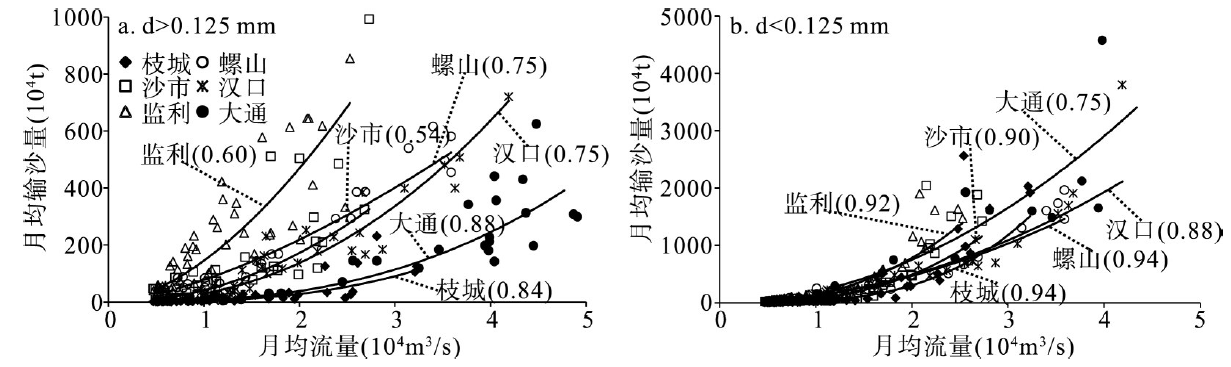 三峡水库蓄水后坝下游d > 0.125 mm和d < 0.125 mm输沙量与流量关系