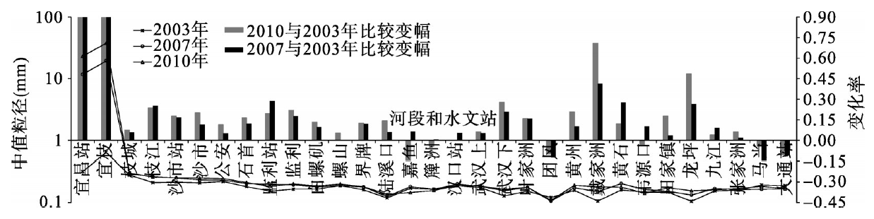 2003年、2007年和2010年三峡水库坝下游河段床沙中值粒径变化