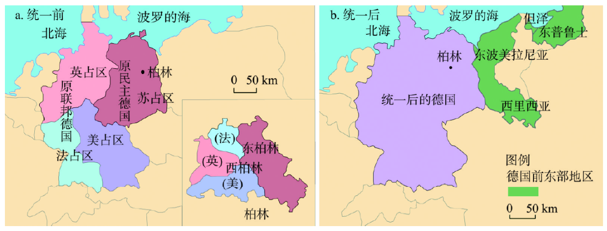 Fig. 3 The change of geo-political pattern after the unification of Germany图3 德国统一前后的政治版图变化 |