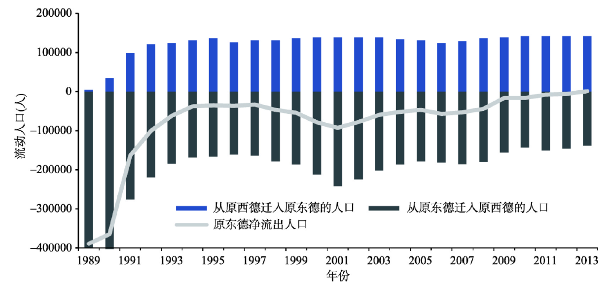 Fig. 4 Migration of population between West and East Germany from 1989 to 2013图4 1989-2013年德国统一后东西部劳动力流动状况 |