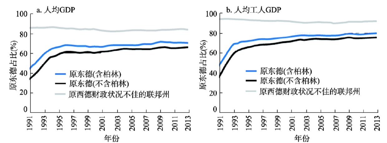 Fig. 5 Comparison of gross domestic production per capita and employee after the unification of Germany(West Germany = 100%)图5 德国统一后东西部人均GDP和人均工人GDP对比(原西德=100%) |