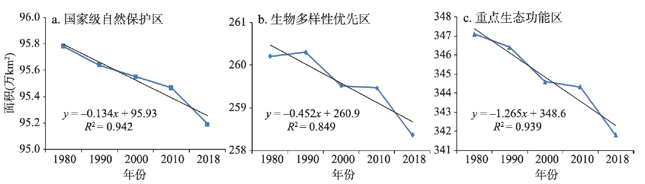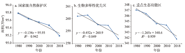 图4 1980—2018年不同重要生态空间内生态用地面积变化趋势Fig. 4 The change trend of ecological land in important natural ecological spaces in China from 1980 to 2018 |