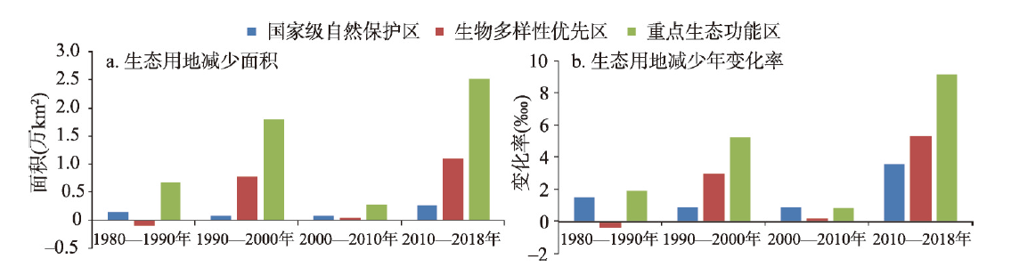 表4 1980—2018年重要生态空间内生态用地面积变化Tab. 4 Change of area and proportion of ecological land in important natural ecological spaces from 1980 to 2018 |