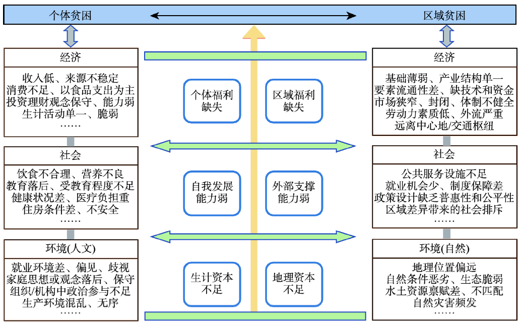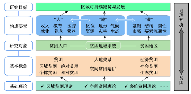 China's poverty alleviation practice has proved that geography has played an extremely important role in supporting anti-poverty targeting and poverty reduction decision-making. However, due to vague basic concepts, lagging basic theories, and an imperfect discipline system, "theoretical poverty" has become the biggest shortcoming restricting the innovation and development of poverty geography. Based on the analysis of the core concept of poverty, this paper systematically analyzed the nature, basic theory, research object, research content, and framework of poverty geography as a branch of the discipline, and put forward the frontier areas of future research on poverty geography. The results show that firstly, poverty refers to the state of inferiority, lack, or insufficiency of various welfares enjoyed by people compared to a certain standard, which has multidimensional, regional, and dynamic characteristics. In terms of measurement standards, absolute poverty emphasizes the minimum value, and relative poverty emphasizes the average value. In terms of target objects, poverty can be divided into individual poverty and regional poverty. The former focuses on the lack and deficiency of individual welfare or capability, while the latter focuses on the regional welfare behind individual welfare from the perspective of space. Secondly, poverty geography is a discipline that studies the formation, distribution, geographic characteristics of poverty-stricken areas, their relationship with the environment, and anti-poverty measures. It takes the impoverished areal system (IAS) as the research object and the poverty-environment nexus as the research core. It has comprehensive, cross-cutting, and regional characteristics, focusing on the study of regional poverty. The basic theories of poverty geography include spatial poverty theory, regional poverty theory, multidimensional poverty theory, and sustainable development theory. Its research content and framework include three dimensions (economic, social, and environmental poverty), two elements (nature and human), two types of objects (regional poverty and individual poverty), and two standards (absolute poverty and relative poverty). Thirdly, there is an urgent need to strengthen the basic research of poverty geography in terms of the evolution of IAS, regional poverty measurement, relative poverty targeting, poverty dynamic monitoring and simulation prediction, urban poverty and rural poverty, poverty alleviation effectiveness evaluation, transformation and development and revitalization path of poor areas. In the situation that we face new challenges of poverty reduction and development at home and abroad, there is an urgent need to constantly innovate and develop the fundamental theory of poverty geography, promote the globalization of China's poverty research, and contribute China's anti-poverty project to the eradication of global extreme poverty.