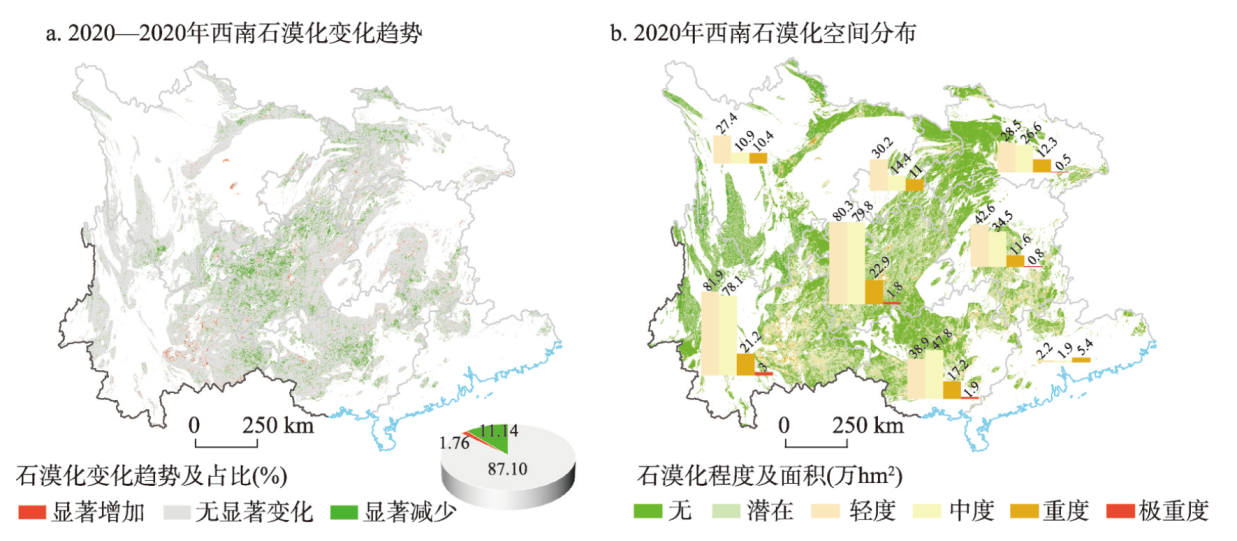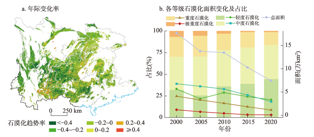 图2 2000—2020年西南石漠化年际变化率和各等级石漠化面积变化及占比Fig. 2 The annual change rate of rocky desertification in Southwest China and the change and proportion of rocky desertification areas in different grades in 2000-2020 |