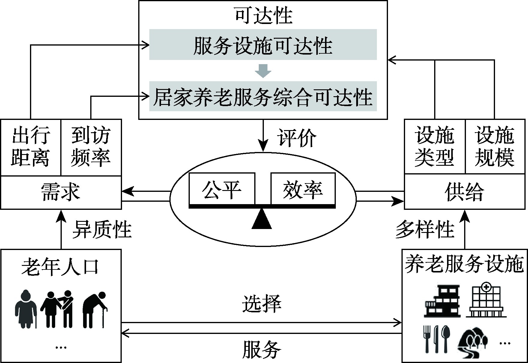 Population aging has become a major issue affecting the socio-economic sustainable development worldwide. In response to China's national situation of "getting old before getting rich", comprehensively improving the level of home-based elderly care services is an inevitable way to meet the multi-level elderly care needs. Based on the public or quasi-public characteristics of elderly care service facilities, a basic framework has been constructed from the perspectives of demand and supply. It takes into account the heterogeneity of elderly care needs and the balance between fairness and efficiency with the core of service facilities accessibility. The data of home-based elderly care needs came from questionnaire surveys and interviews with 545 elderly people aged 60 and above from 2021 to 2023 in Beijing, which included the needs for daily dining, cultural and sports activities, medical and health services and daytime care. The other data included 1 km population grid, permanent population and population ratio of different age groups, and POI of elderly care service facilities. By using SPSS statistical analysis and two-step floating catchment area method, the heterogeneity of home-based elderly care needs were analyzed and applied in evaluating accessibility of different elderly care service facilities. Dagum Gini coefficient and bivariate spatial autocorrelation method were used to analyze the spatial fairness and efficiency of comprehensive accessibility. The study found that (1) the individual attributes of elderly people certainly determine the heterogeneity of elderly care needs. Retirement status, census register, educational level, occupation (before retirement) and age are the important factors. (2) When the heterogeneity of elderly care needs was taken into account, the positive correlation between the accessibility and the satisfaction survey results is more significant. Compared to neglecting the heterogeneity, the result better revealed the matching relationship between service facilities and elderly care needs as well as significant spatial differences. (3) The comprehensive accessibility of home-based elderly care service facilities shows spatial unfairness with a gradually decreasing regional difference from the city center to the suburbs. However, the allocation of service facilities in most areas has taken into account utilization efficiency.