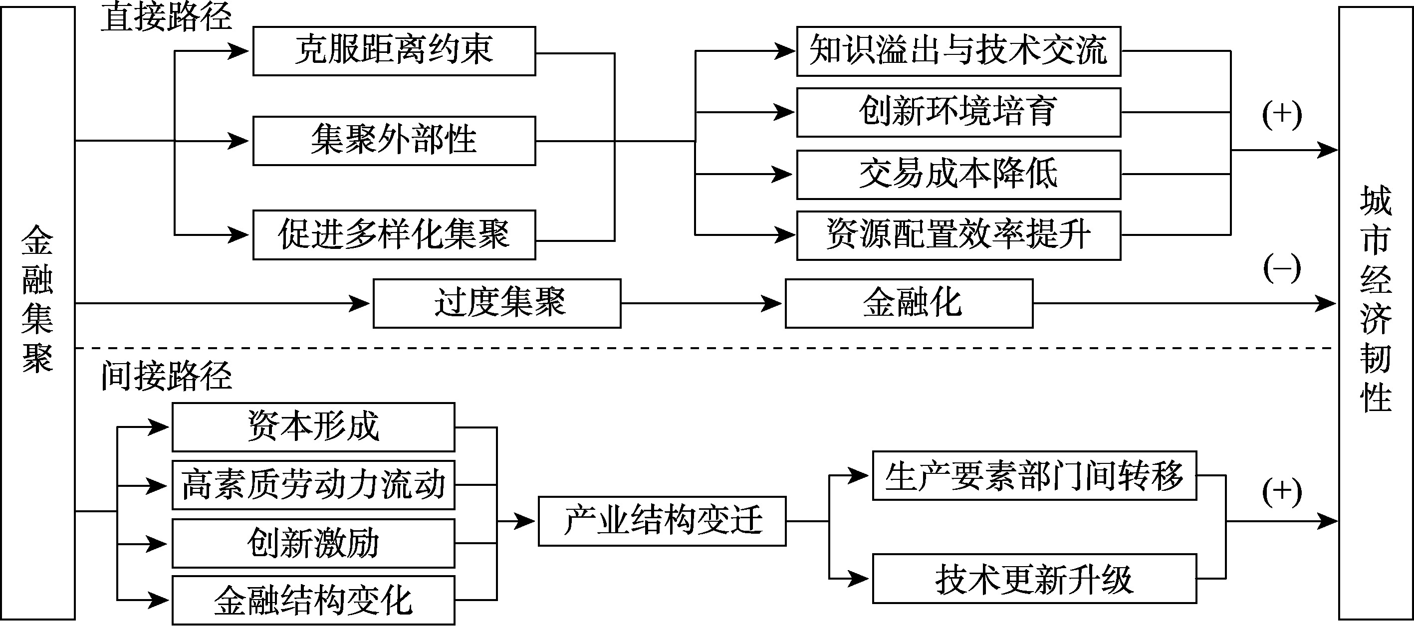 Financial agglomeration and economic resilience have become the hot and frontier field in economic geography. It is of great theoretical and practical significance to study the influence of financial agglomeration on urban economic resilience. Based on the analysis of relevant theories and research progress, this paper measures the level of financial agglomeration and economic resilience of 285 cities at or above the prefecture level from 2008 to 2021, and analyzes the overall characteristics, development process and spatial pattern characteristics of the above indicators. An econometric model is constructed to study the influence of financial agglomeration on economic resilience. The findings are as follows: (1) At the initial stage of the study, financial agglomeration mainly occurred in the central cities of Beijing-Tianjin-Hebei region, Yangtze River Delta and Pearl River Delta; Subsequently, the degree of financial agglomeration in some cities in the central and western regions increased. The spatial distribution of financial agglomeration showed a diffusion phenomenon, from point-like distribution to blocky distribution. (2) The high value of urban economic resilience is mainly distributed in the central and western regions of China, and shows a trend of transferring from north to south and west to the central region. The overall level of economic resilience in the northeast region is not high, and the level of economic resilience declines significantly at the end of the study. (3) The full sample regression results show that, at the level of prefecture-level cities, the direct impact of financial agglomeration on urban economic resilience presents a significant inverted U-shaped relationship of first rising and then declining. The influence of financial agglomeration on economic resilience has a positive spatial spillover effect, and the local economic resilience will be positively weighted by the level of financial agglomeration in the surrounding areas. (4) The estimation results of the intermediary effect model show that with the improvement of the level of financial agglomeration, the industrial structure will deviate from the secondary industry, and the change of industrial structure can become the intermediary variable of financial agglomeration affecting the urban economic resilience. (5) Regional heterogeneity test results show that financial agglomeration has a negative spillover effect on economic resilience in the eastern region; The spatial spillover effect of the western and northeast regions is weak, and the spillover effect is relatively not obvious. The test of city type heterogeneity shows that for all types of cities, the direct promoting effect of financial agglomeration on economic resilience is significant, but the promoting effect is manifested as resource-based cities and old industrial cities > general cities > provincial capitals and sub-provincial cities.