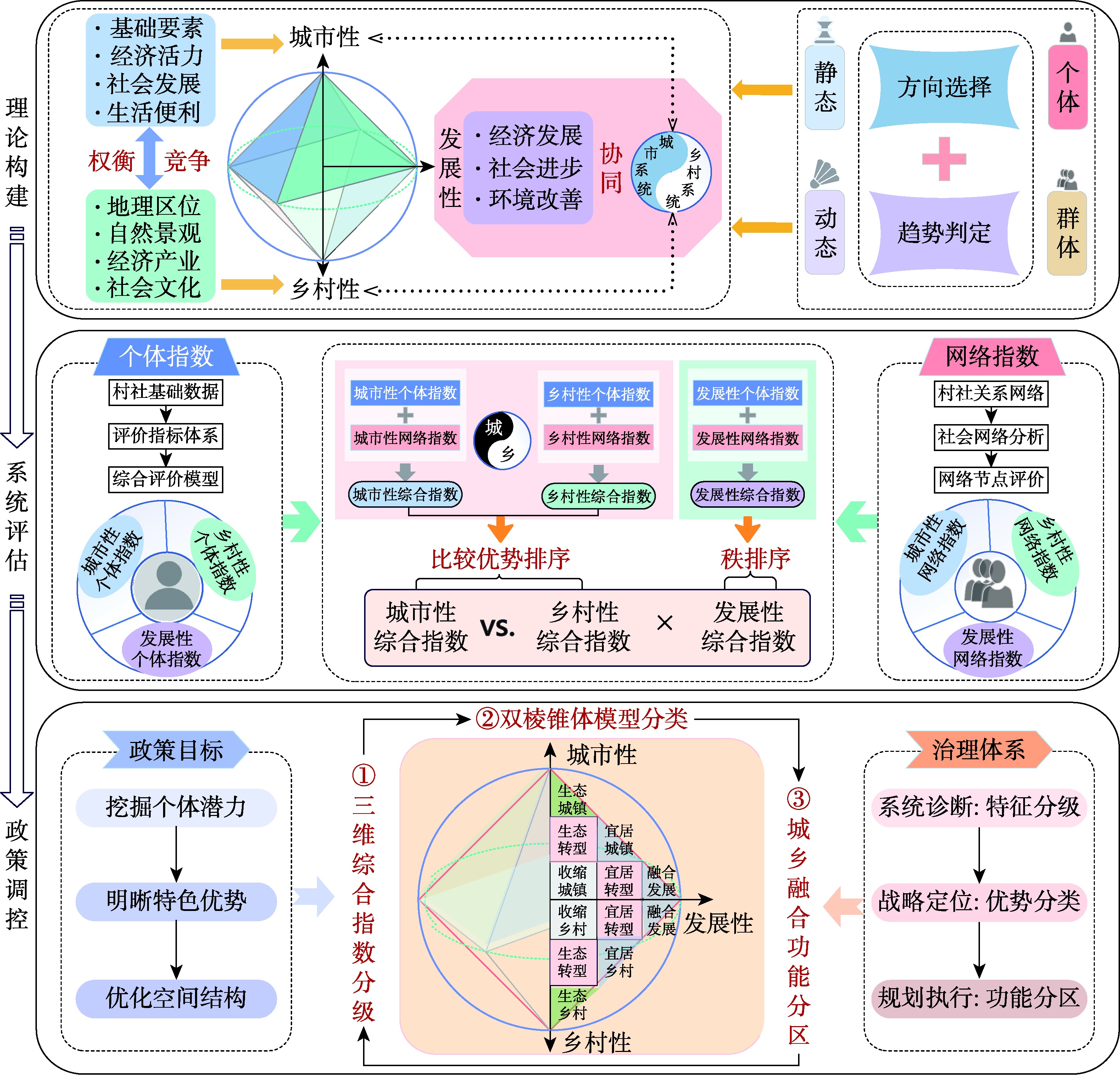 The growing recognition of bidirectional urban-rural resource flows reveals the inadequacy of the traditional urbanization model, which conceptualizes development as a one-way rural-to-urban transition, in explaining the complex evolution of county-level rural-urban relations. This study proposes an "Urbanity vs. Rurality × Development" double pyramid framework that unifies villages and communities within a single assessment system, enabling a comprehensive analysis of rural-urban relations. Using villages and communities in Shanting district, Zaozhuang city as the basic evaluation units, this study draws on multi-source data, to develop a methodology for assessing individual and network indices through comprehensive evaluation and social network analysis; and then it conducts a three-level spatial structure analysis of the study area via a "grading-categorization-zoning" approach. The results are shown as follows. (1) Within the individual index of Shanting district, urbanity exhibits a multi-polar and scattered distribution, whereas rurality forms contiguous high-value clusters across the plains. Development is shaped by multiple interacting factors, resulting in an overall spatial equilibrium accompanied by localized dispersion. (2) After accounting for village-community network connections, the three-dimensional indices reveal a more pronounced spatial pattern: urbanity forms multi-polar linkages, rurality diffuses west to east, and development exhibits multi-directional diffusion. (3) In terms of grading, "middle development-high urbanity" areas account for the largest share; in terms of categorization, integrated development areas are the dominant type; and in terms of zoning, the pilot zones for urban-rural integration hold the highest proportion. A spatial system centered on factor linkage and functional agglomeration is thus initially established. The study concludes by proposing context-specific strategies, providing theoretical and practical insights into urban-rural restructuring, especially in evaluating unified villages and communities and analyzing their multidimensional interactions.