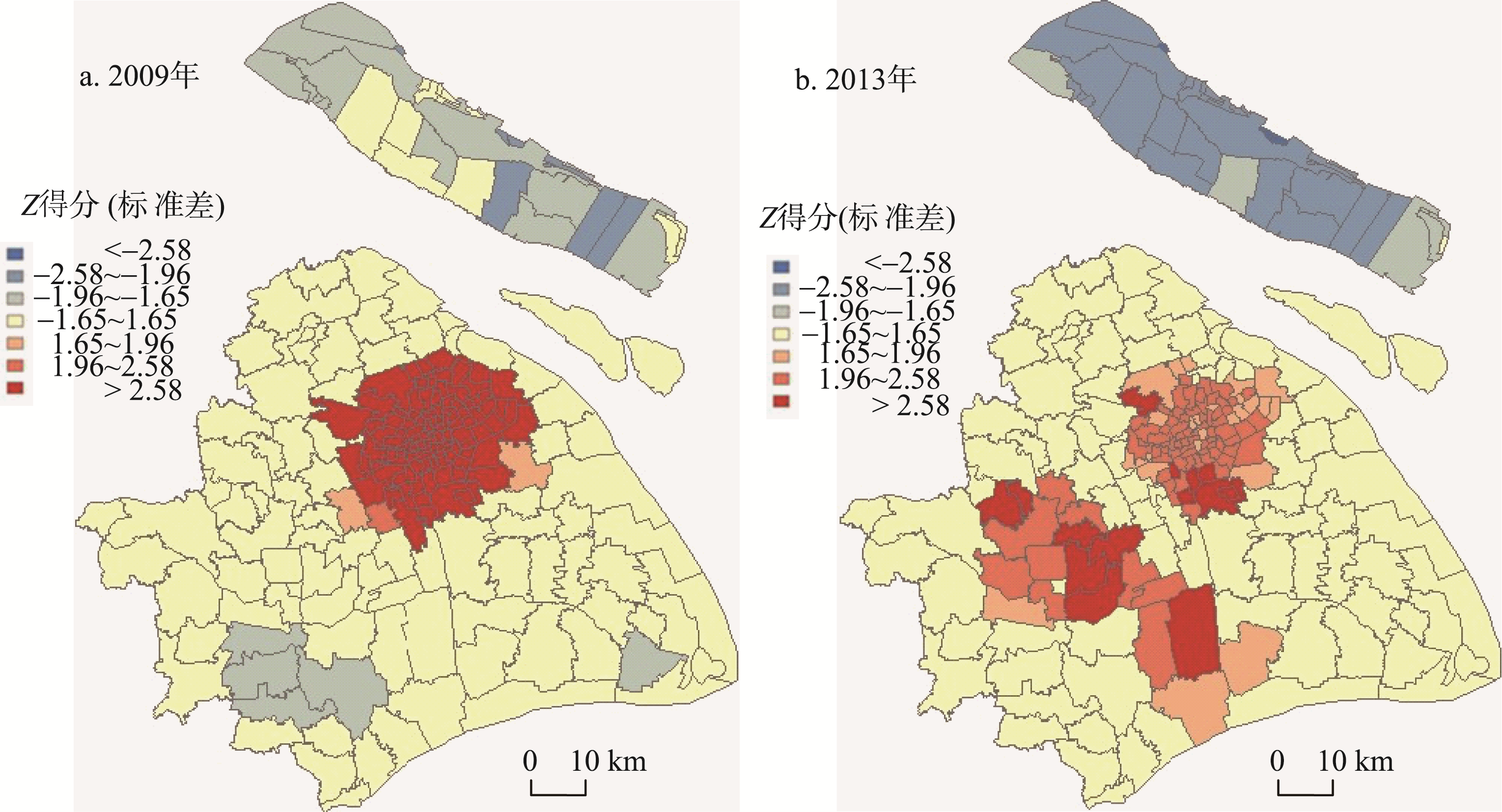 | 图2 2009年与2013年上海移动WLAN热点的空间集聚状况比较 |