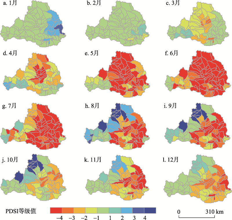 | 图4 基于SWAT-PDSI的渭河流域1995年干旱逐月演变过程 |