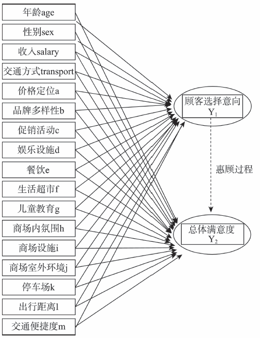 基于上述分析,本文确定了6个对顾客选择购物中心产生作用的影响因子,分别是环境因子、可达性因子、个人特征因子、商品因子、私家车出行因子,以及多功能因子。其中,可达性因子和私家车出行因子涉及了购物中心所处的地理位置、周围交通是否便利以及是否配备停车场、停车场的布局规划是否合理或停车位是否够用等问题,这些因素间都有一定的关联[5]。如果购物中心位于郊区可能会导致周围交通不便、客源量较小,而购物中心位于市区中心可能交通十分便利,但占地面积的局限性也可能导致停车场较小或布局不合理等问题。